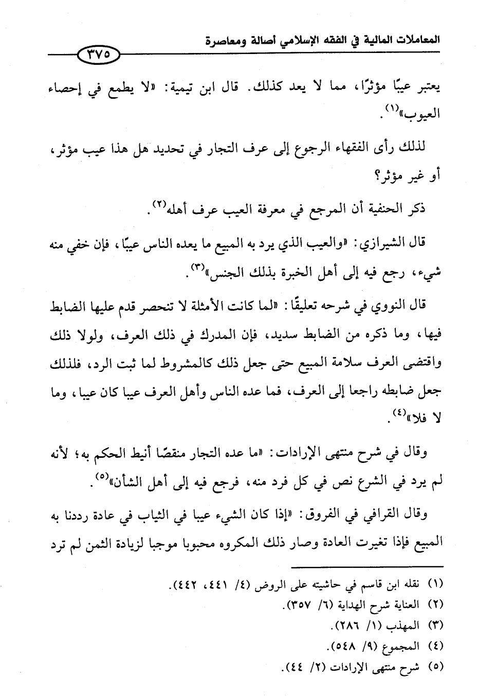 وقال القرافي في الفروق: "إذا كان الشيء عيبا في الثياب في عادة رددنا به المبيع فإذا تغيرت العادة وصار ذلك المكروه محبوبا موجبا لزيادة الثمن لم ترد