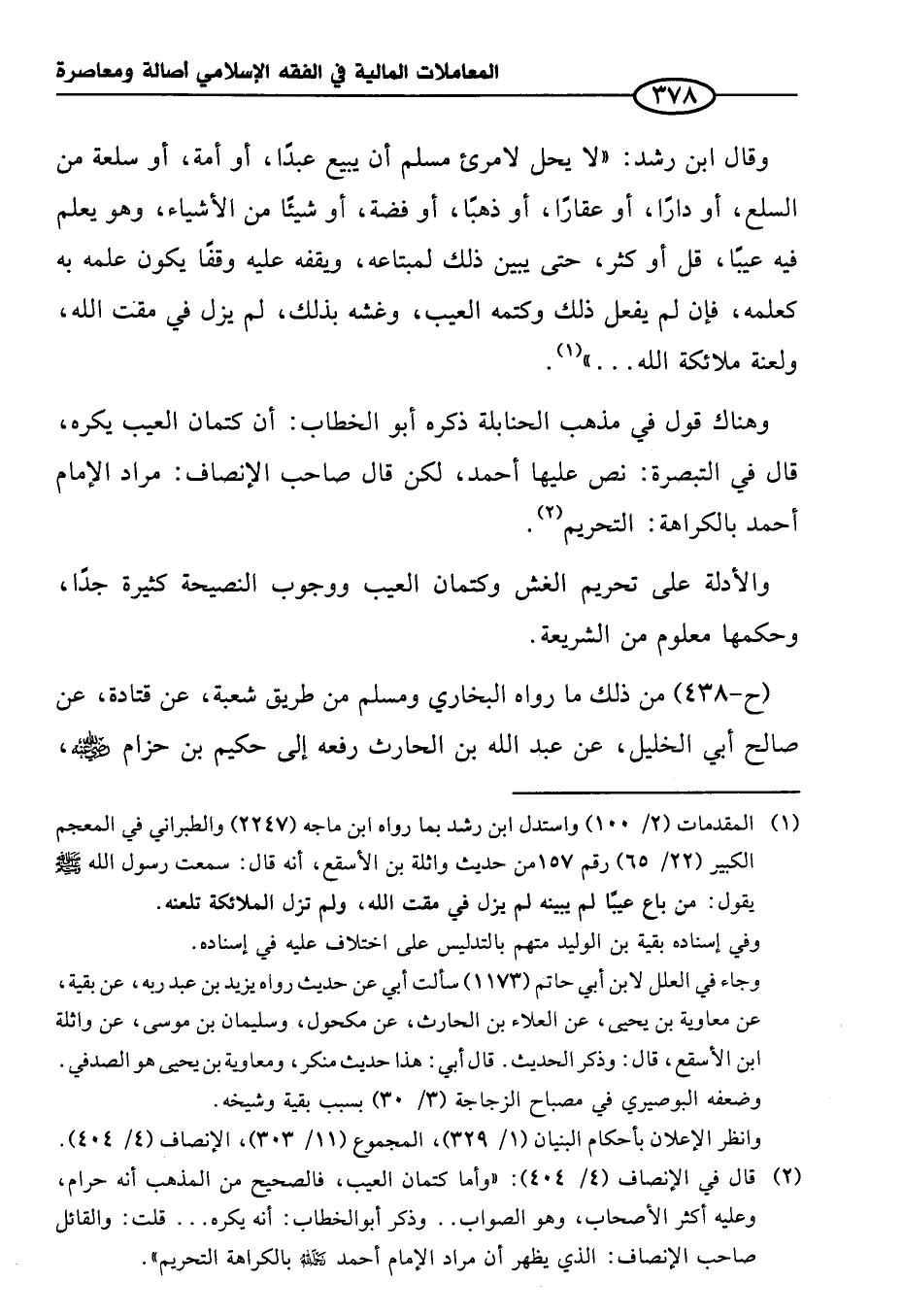 (¬١) المقدمات (٢/ ١٠٠) واستدل ابن رشد بما رواه ابن ماجه (٢٢٤٧) والطبراني في المعجم الكبير (٢٢/ ٦٥) رقم ١٥٧ من حديث واثلة بن الأسقع، أنه قال: سمعت رسول الله - صلى الله عليه وسلم - يقول: من باع عيبًا لم يبينه لم يزل في مقت الله، ولم تزل الملائكة تلعنه.