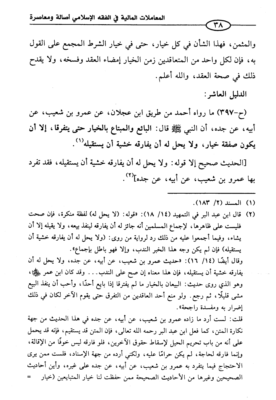 قلت: لست أرد ما زاده عمرو بن شعيب، عن أبيه، عن جده في هذا الحديث من جهة نكارة المتن، كما فعل ابن عبد البر رحمه الله تعالى، فإن المتن قد يستقيم، فإنه قد يحمل على أنه من باب تحريم الحيل لإسقاط حقوق الآخرين، فلو فارقه ليس خوفًا من الإقالة، وإنما فارقه لحاجة، لم يكن حرامًا عليه، ولكني أرده من جهة الإسناد، فلست ممن يرى الاحتجاج فيما يتفرد به عمرو بن شعيب، عن أبيه، عن جده على غيره، وأين أحاديث الصحيحين وغيرها من الأحاديث الصحيحة ممن حفظت لنا خيار المتبايعين (خيار =