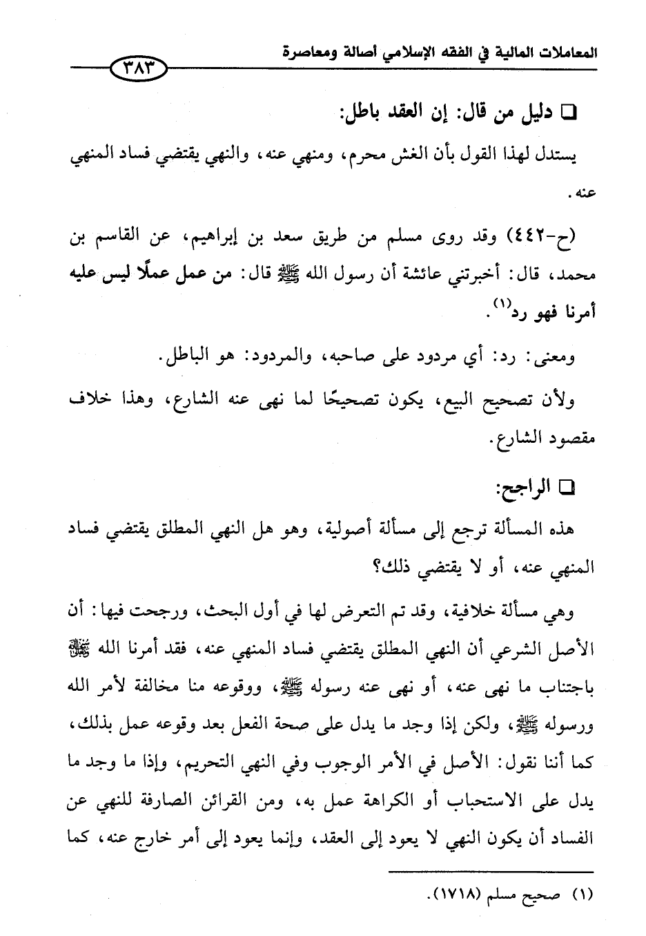 (ح-٤٤٢) وقد روى مسلم من طريق سعد بن إبراهيم، عن القاسم بن محمد، قال: أخبرتني عائشة أن رسول الله - صلى الله عليه وسلم - قال: من عمل عملًا ليس عليه أمرنا فهو رد (¬١).