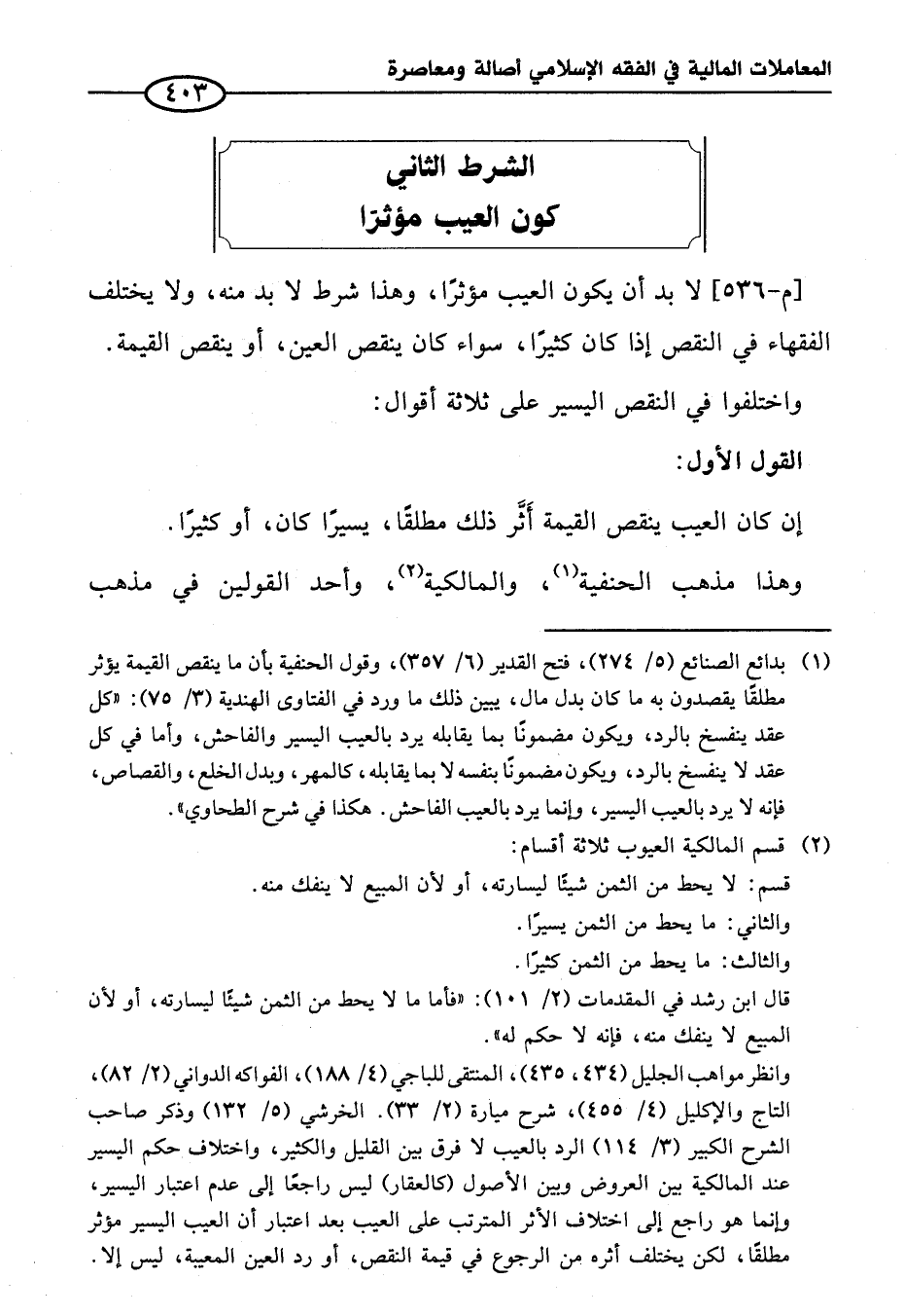 [م - ٥٣٦] لا بد أن يكون العيب مؤثرًا، وهذا شرط لا بد منه، ولا يختلف الفقهاء في النقص إذا كان كثيرًا، سواء كان ينقص العين، أو ينقص القيمة.