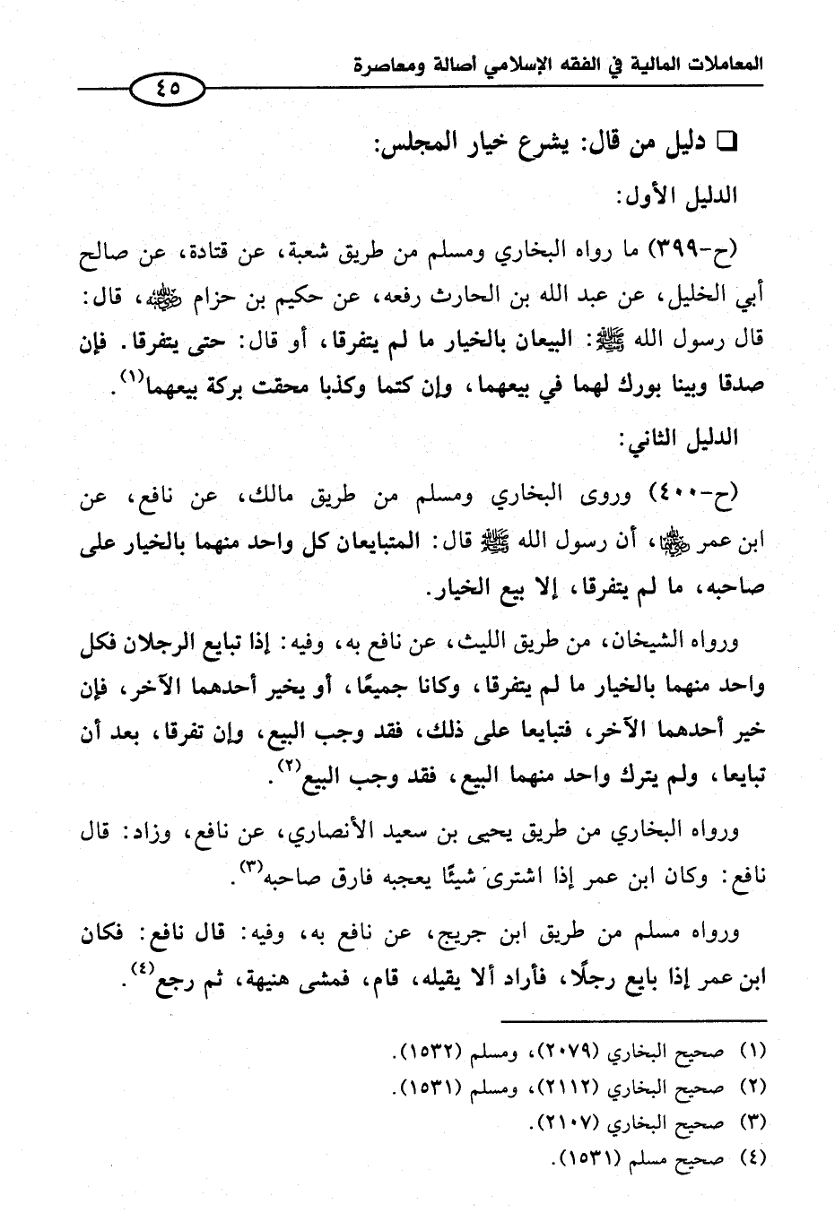 (ح-٤٠٠) وروى البخاري ومسلم من طريق مالك، عن نافع، عن ابن عمر - رضي الله عنهما -، أن رسول الله - صلى الله عليه وسلم - قال: المتبايعان كل واحد منهما بالخيار على صاحبه، ما لم يتفرقا، إلا بيع الخيار.
