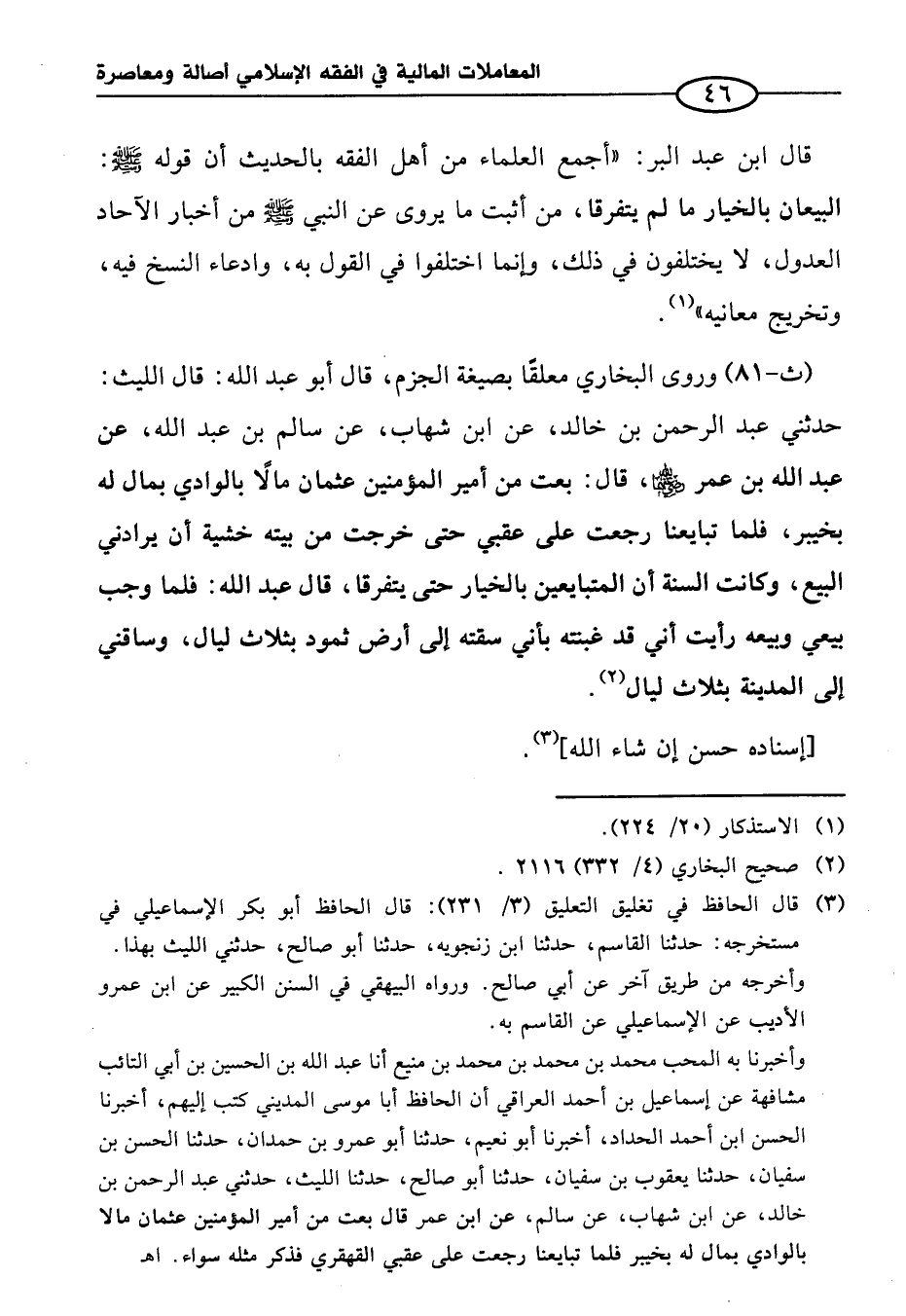 عبد الله بن عمر - رضي الله عنهما -، قال: بعت من أمير المؤمنين عثمان مالاً بالوادي بمال له