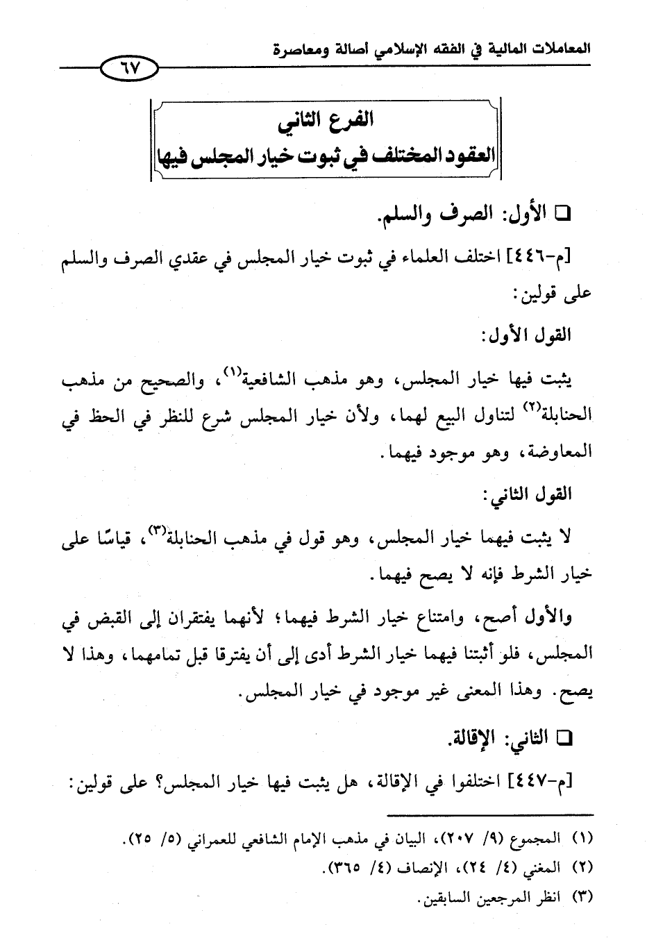 [م - ٤٤٦] اختلف العلماء في ثبوت خيار المجلس في عقدي الصرف والسلم على قولين: