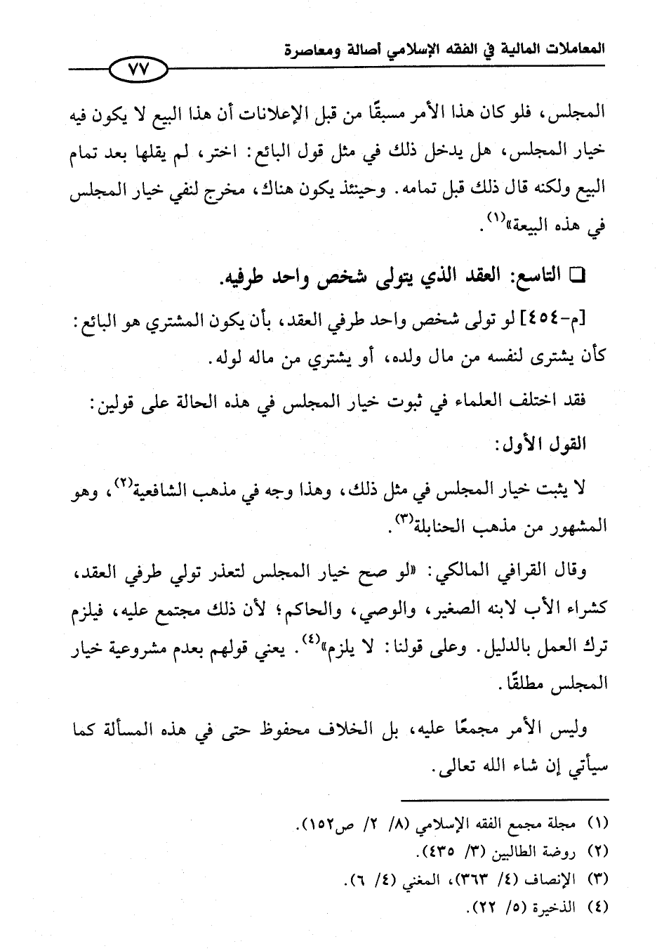 وقال القرافي المالكي: "لو صح خيار المجلس لتعذر تولي طرفي العقد، كشراء الأب لابنه الصغير, والوصي، والحاكم؛ لأن ذلك مجتمع عليه، فيلزم ترك العمل بالدليل. وعلى قولنا: لا يلزم" (¬٤). يعني قولهم بعدم مشروعية خيار المجلس مطلقًا.
