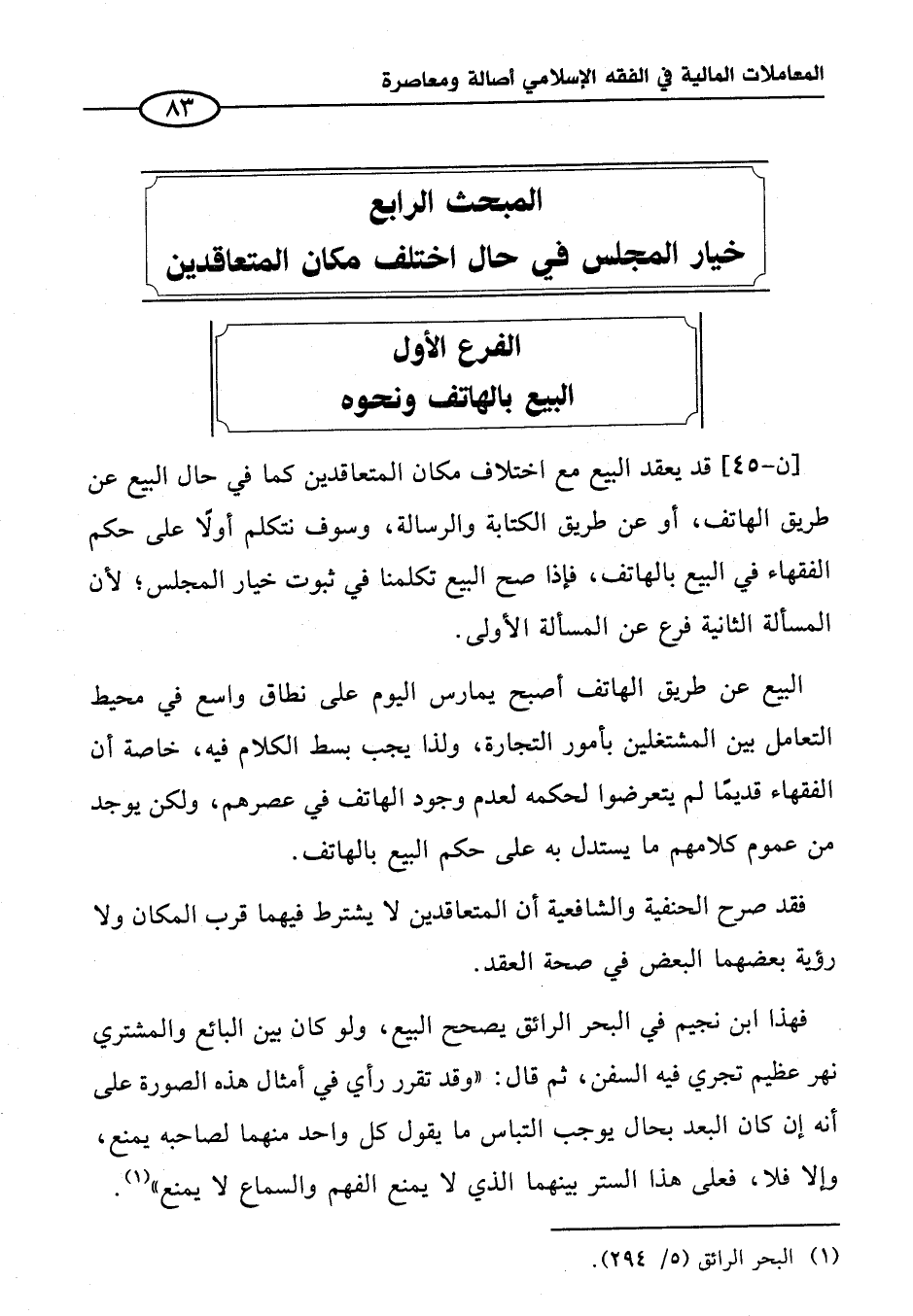 [ن-٤٥] قد يعقد البيع مع اختلاف مكان المتعاقدين كما في حال البيع عن طريق الهاتف، أو عن طريق الكتابة والرسالة، وسوف نتكلم أولاً على حكم الفقهاء في البيع بالهاتف، فإذا صح البيع تكلمنا في ثبوت خيار المجلس؛ لأن المسألة الثانية فرع عن المسألة الأولى.