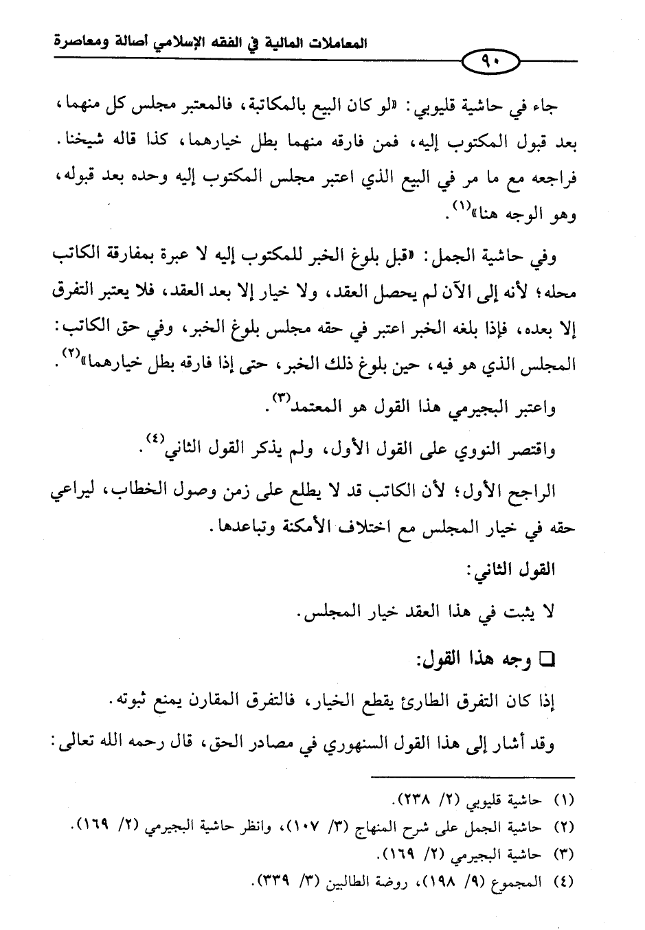 وفي حاشية الجمل: "قبل بلوغ الخبر للمكتوب إليه لا عبرة بمفارقة الكاتب محله؛ لأنه إلى الآن لم يحصل العقد، ولا خيار إلا بعد العقد، فلا يعتبر التفرق إلا بعده، فإذا بلغه الخبر اعتبر في حقه مجلس بلوغ الخبر، وفي حق الكاتب: المجلس الذي هو فيه، حين بلوغ ذلك الخبر، حتى إذا فارقه بطل خيارهما" (¬٢).