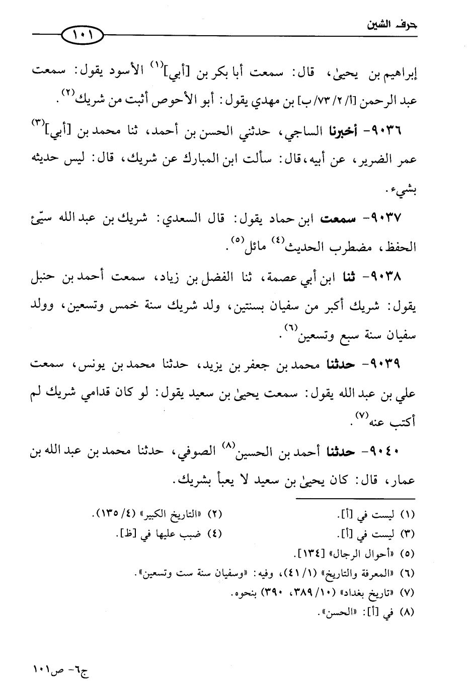 9038 - حَدثنا ابن أبي عصمة، حَدثنا الفضل بن زياد، سمعت أحمد بن حنبل يقول: شَريك أكبر من سفيان بسنتين، ولد شَريك سنة خمس وتسعين، وولد سفيان سنة سبع وتسعين.