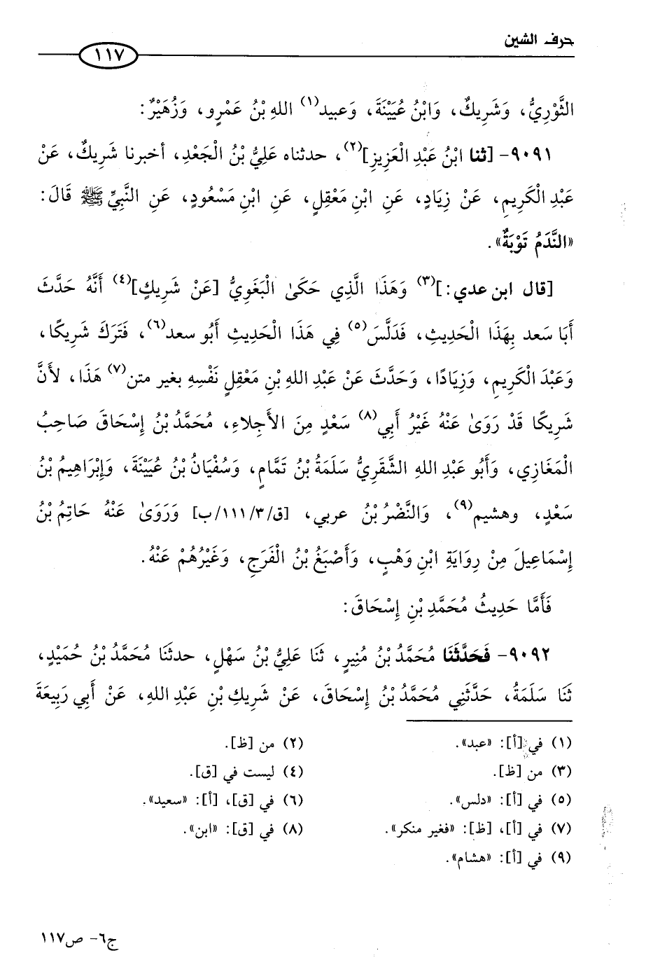 9091 - حَدثنا ابن عَبد العزيز، حَدثناهُ علي بن الجعد، أَخبَرنا شَريك، عن عَبد الكريم، عن زياد، عن ابن معقل، عن ابن مسعود، عن النبي صَلي الله عَليه وسَلم، قال: الندم توبة.
