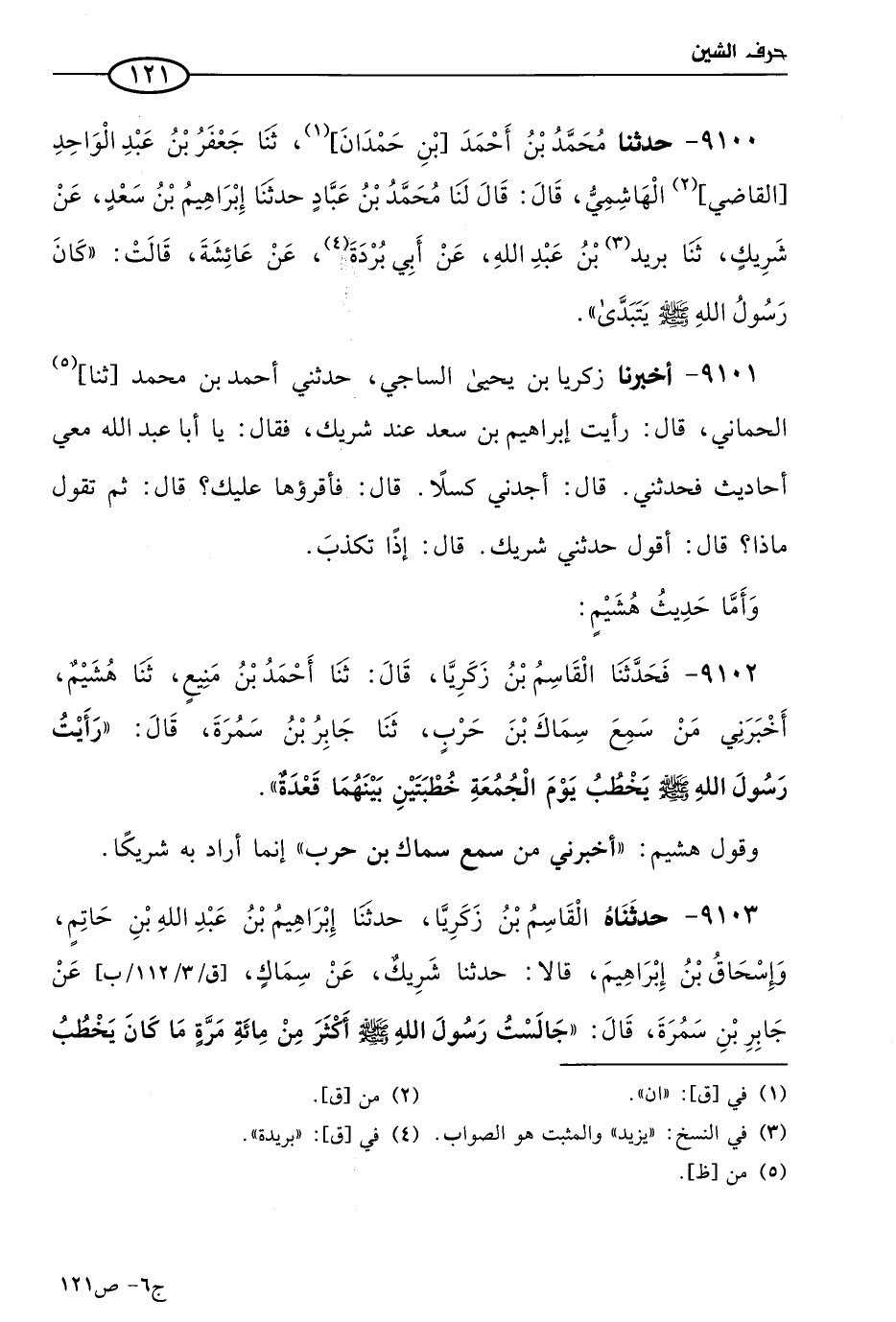 9102 - فحدثنا القاسم بن زكريا، قال: حَدثنا أحمد بن منيع، حَدثنا هشيم، أخبرني من سمع سماك بن حرب، حَدثنا جابر بن سمرة، قال: رأيتُ رسول الله صَلي الله عَليه وسَلم يخطب يوم الجمعة خطبتين بينهما قعدة.