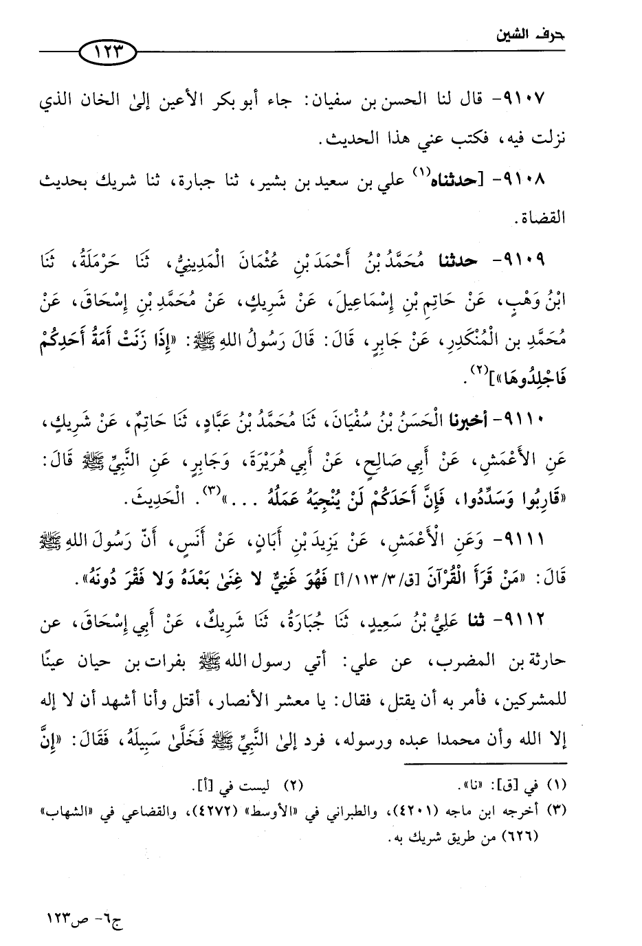 9108 - حَدثناهُ علي بن سعيد بن بشير، حَدثنا جبارة، حَدثنا شَريك، بحديث القضاة.