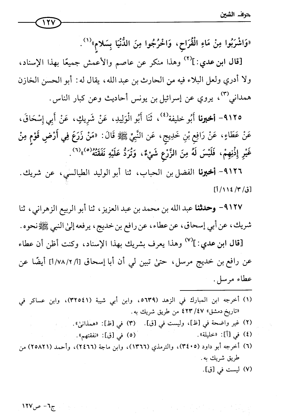 9127 - وحدثنا عَبد الله بن مُحمد بن عَبد العزيز، حَدثنا أَبو الربيع الزهراني، حَدثنا شَريك، عن أبي إسحاق، عن عَطاء، عن رافع بن خديج، يرفعه إلي النبي صَلي الله عَليه وسلم، نحوه.