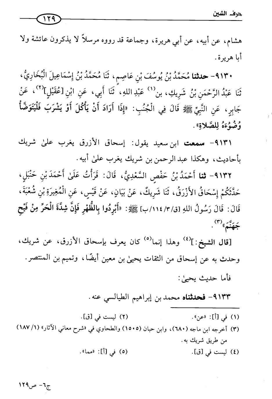 9132 - حَدثنا أحمد بن حفص السعدي قال: قرأت علي أحمد بن حنبل: حدثكم إسحاق الأزرق، حَدثنا شَريك، عن بيان، عن قيس، عن المغيرة بن شُعبَة، قال: قال رسول الله صَلي الله عَليه وسَلم: أبردوا بالظهر فإن شدة الحر من فيح جهنم.