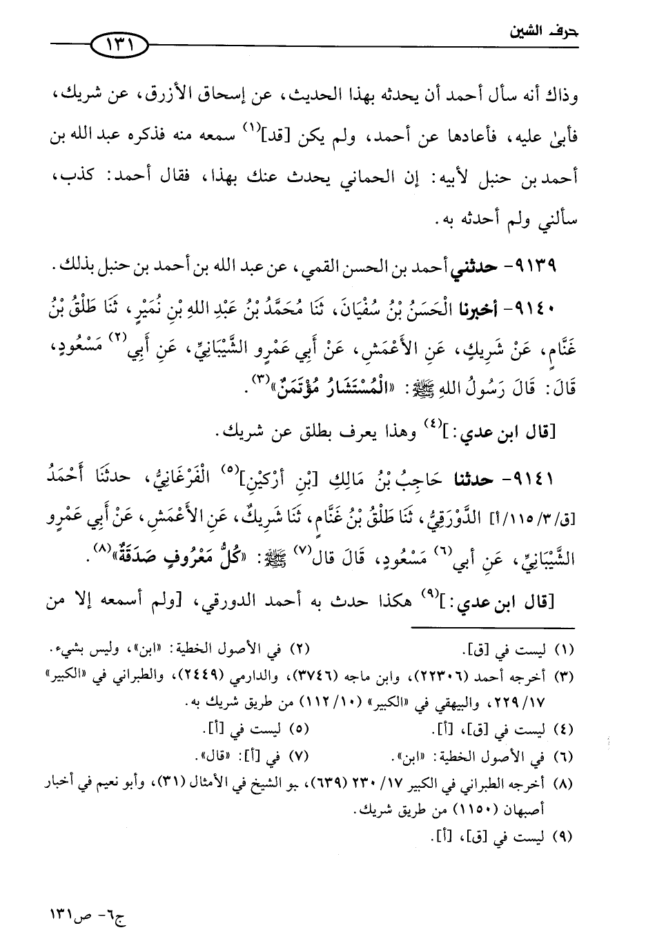 9141 - حَدثنا حاجب بن مالك بن أركين الفرغاني، حَدثنا أحمد الدورقي، حَدثنا طلق بن غنام، حَدثنا شَريك، عن الأَعمَش، عن أبي عَمرو الشيباني، عن ابن مسعود (1)، قال رسول الله صَلي الله عَليه وسلم: كل معروف صدقة.