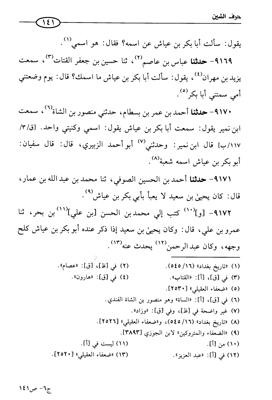 9170 - حَدثنا أحمد بن عُمر بن بسطام، حَدَّثني منصور بن الشاة، سمعتُ ابن نُمَير يقول: سَمعتُ أبا بكر بن عياش يقول: اسمي وكنيتي واحد.