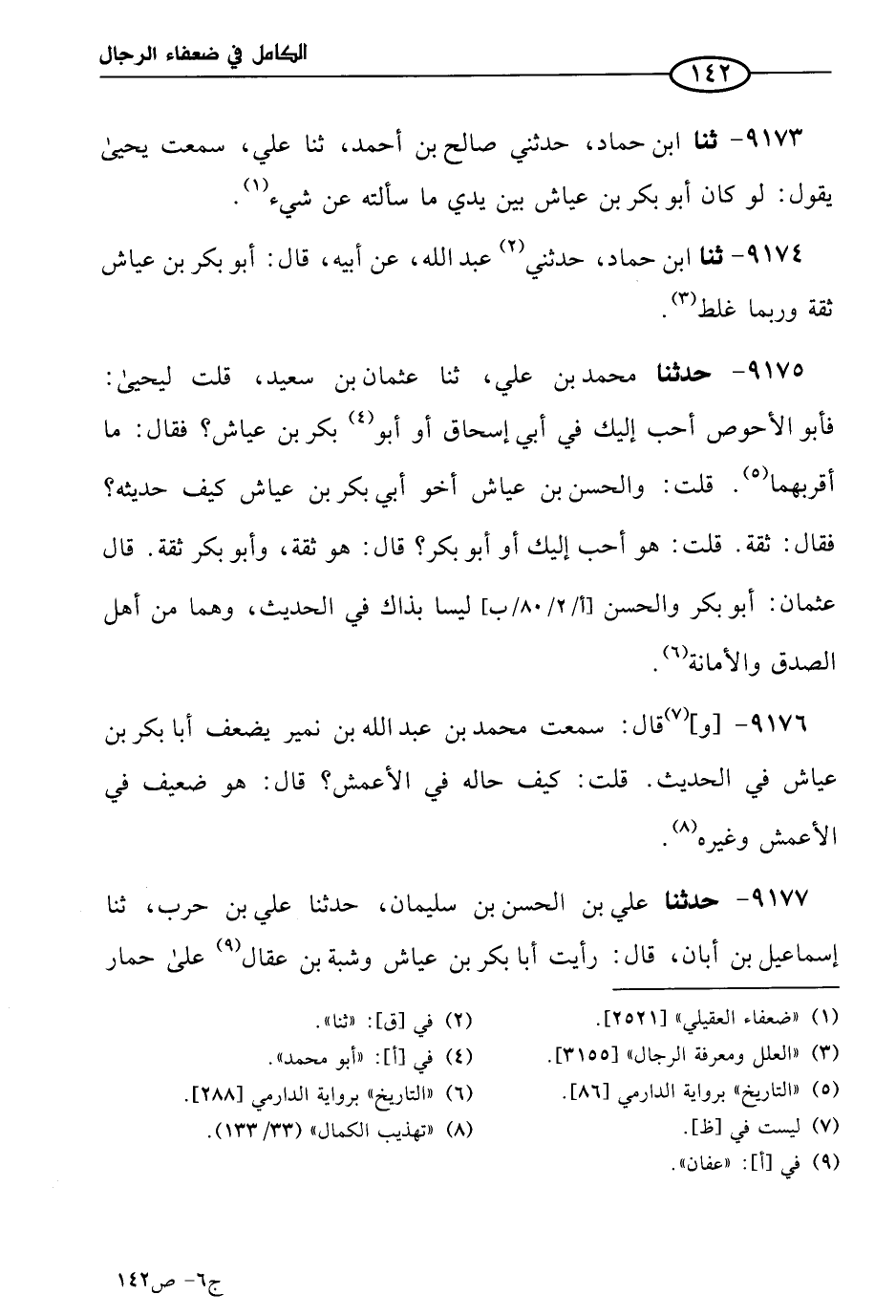 9176 - وقال: سمعتُ مُحمد بن عَبد الله بن نُمَير يضعف أبا بكر بن عياش في الحديث، قلت: كيف حاله في الأَعمَش؟ قال: هو ضعيف في الأَعمَش وغيره.