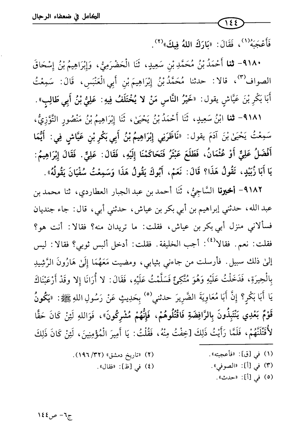 9180 - حَدثنا أحمد بن مُحمد بن سعيد، حَدثنا الحضرمي وإبراهيم بن إسحاق الصواف، قالا: حَدثنا مُحمد بن إبراهيم بن أبي العنبس، قال: سمعتُ أبا بكر بن عياش يقول: خير الناس من لا يختلف فيه: علي بن أبي طالب.