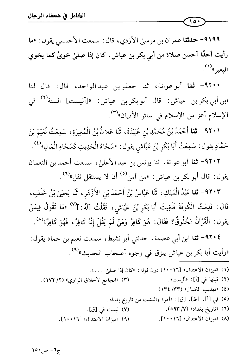 9203 - حَدثنا عَبد الملك، حَدثنا عباس بن أحمد بن الأزهر، حَدثنا يَحيي بن خلف قال: قدمت الكوفة فلقيت أبا بكر بن عياش فقلت له: ما تقول فيمن يقول القرآن مخلوق؟ فقال: هو كافر، ومن لم يقل إنه كافر فهو كافر.