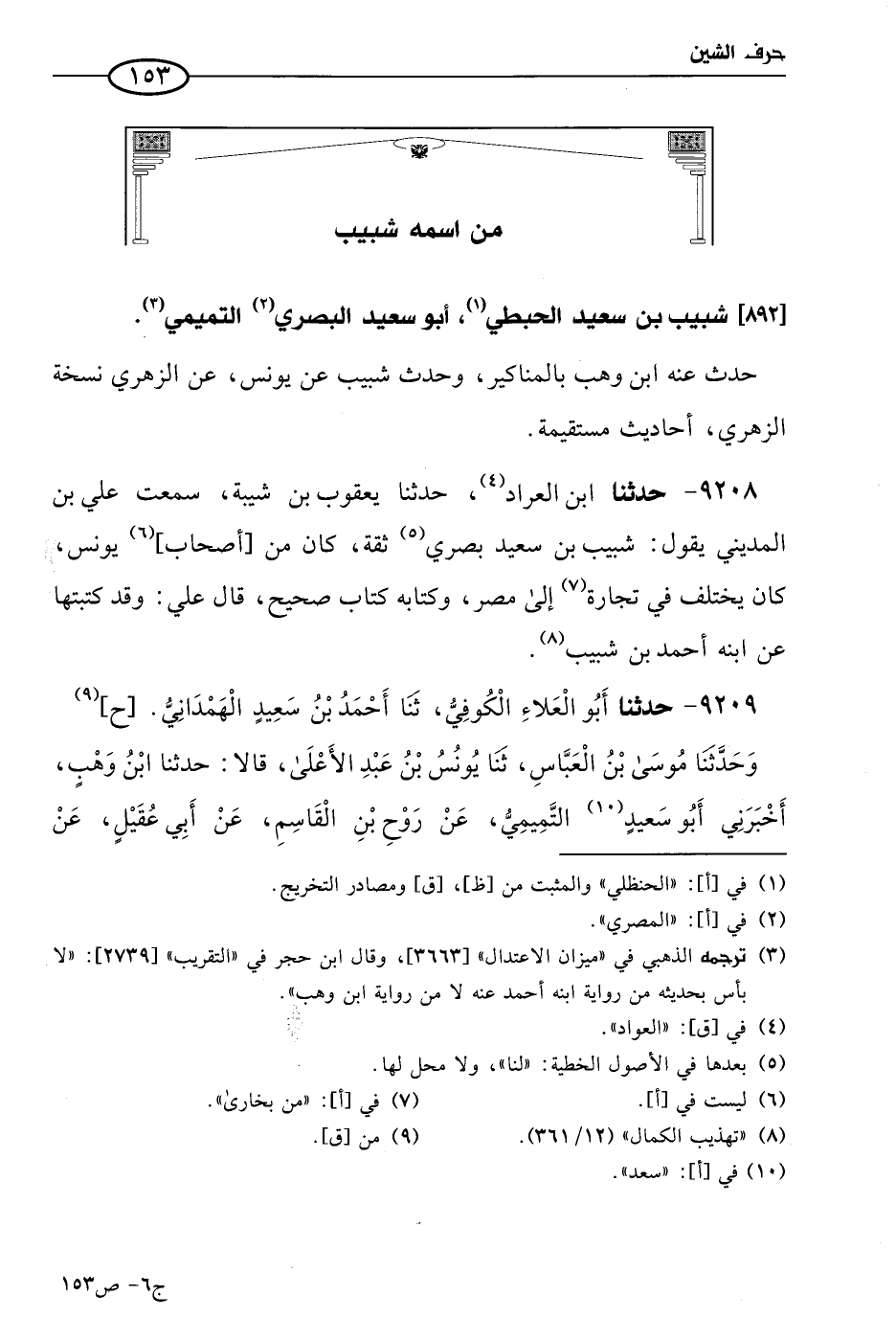 9208 - حَدثنا ابن العراد، حَدثنا يعقوب بن شيبة، سمعت علي بن المديني يقول: شبيب بن سعيد بصري ثقة، كان من أصحاب يُونُس، كان يختلف في تجارة إلي مصر، وكتابه كتاب صحيح، قال علي: وقد كتبتها عن ابنه أحمد بن شبيب.