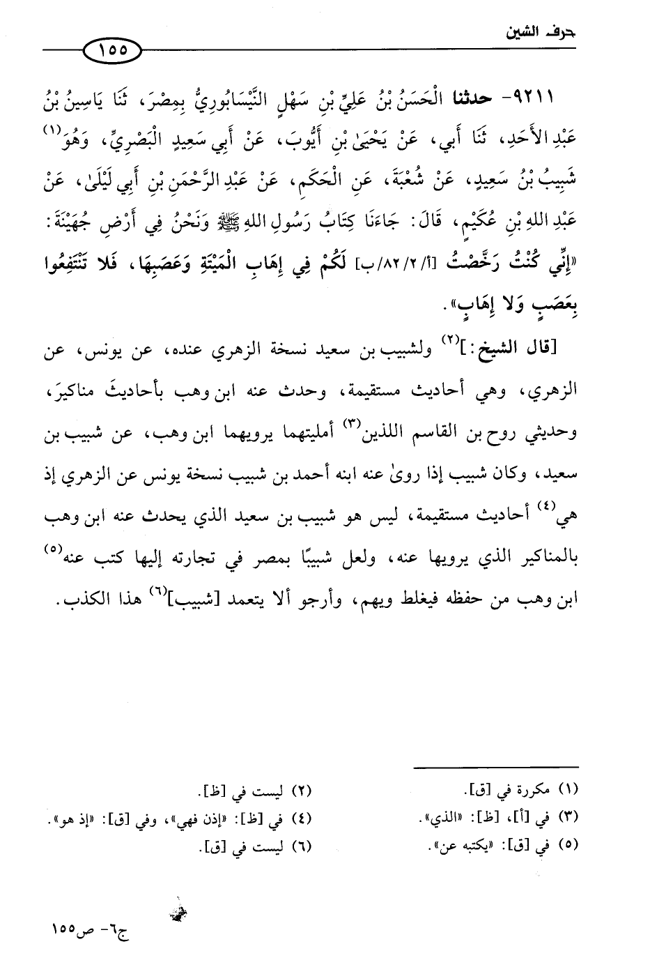 9211 - حَدثنا الحسن بن علي بن سهل النيسابوري بمصر، حَدثنا ياسين بن عَبد الأحد، حَدثنا أبي، عن يَحيي بن أيوب، عن أبي سعيد البصري، وهو شبيب بن سعيد، عن شُعبَة، عن الحكم، عن عَبد الرحمن بن أبي ليلي، عن عَبد الله بن عكيم قال: جاءنا كتاب رسول الله صَلي الله عَليه وسَلم ونحن في أرض جهينة: إني كنت رخصت لكم في إهاب الميتة وعصبها، فلا تنتفعوا بعصب، ولا إهاب.