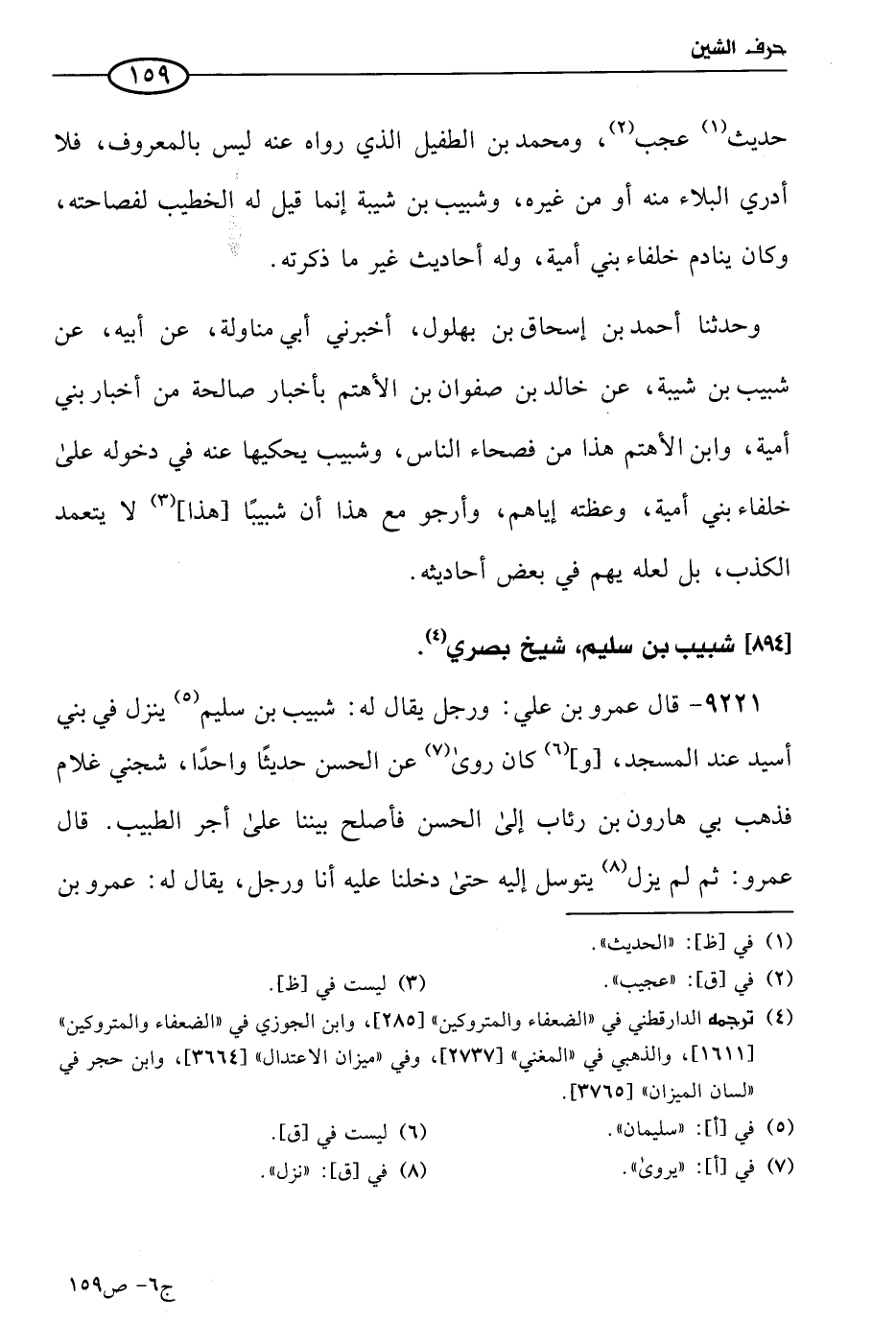 9221 - قال عَمرو بن علي: ورجل يُقال له: شبيب بن سليم، ينزل في بني أسيد عند المسجد، وكان روي عن الحسن حديثًا واحدا، شجني غلام فذهب بي هارون بن رئاب إلي الحسن فأصلح بيننا علي أجر الطبيب. قال عَمرو: ثم لم يزل يتوسل إليه حتي دخلنا عليه أنا ورجل يُقال له: عَمرو بن هارون4 البكراوي، سمعته يقول: سَمعتُ الحسن يقول، حتي حدث بنحو من ثلاثين حديثًا، قال عَمرو: وكان صبيا كيف يسمع من الحسن؟.