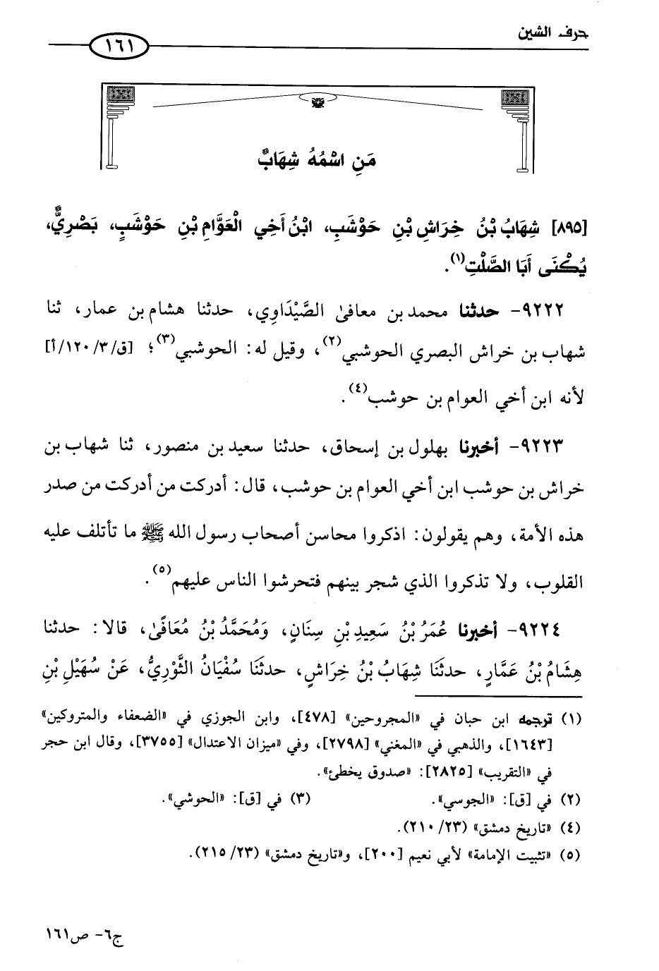 9222 - حَدثنا مُحمد بن مُعَافَي الصيداوي، حَدثنا هشام بن عمار، حَدثنا شهاب بن خراش البصري الحوشبي، وقِيل له: الحوشبي لأنه ابن أخي العوام بن حوشب.