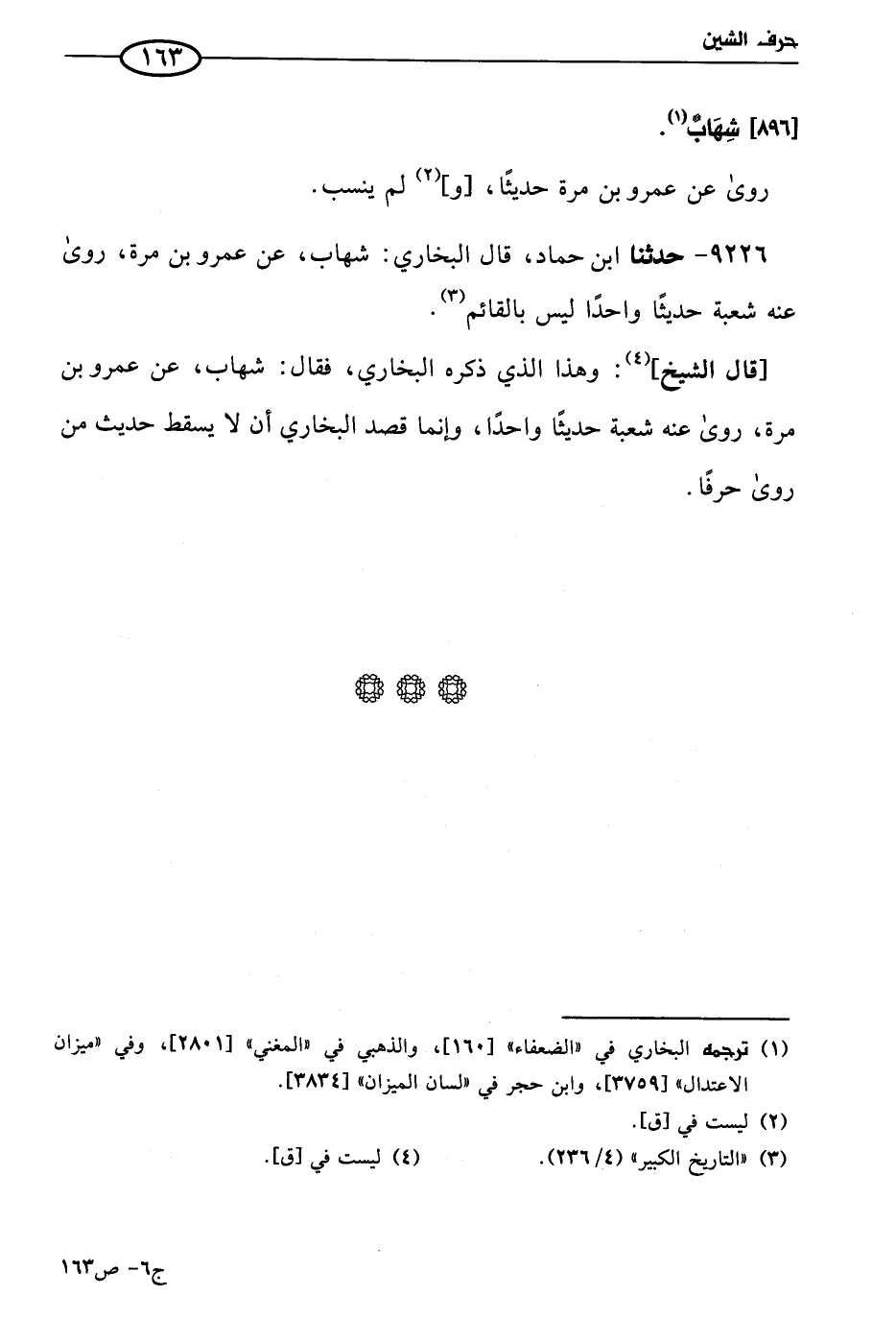 قال الشيخ: وهذا الذي ذكره البُخاري فقال: شهاب، عن عَمرو بن مرة روي عنه شُعبَة حديثًا واحدا، وإِنما قصد البُخاري أن لا يسقط حديث من روي حرفا.