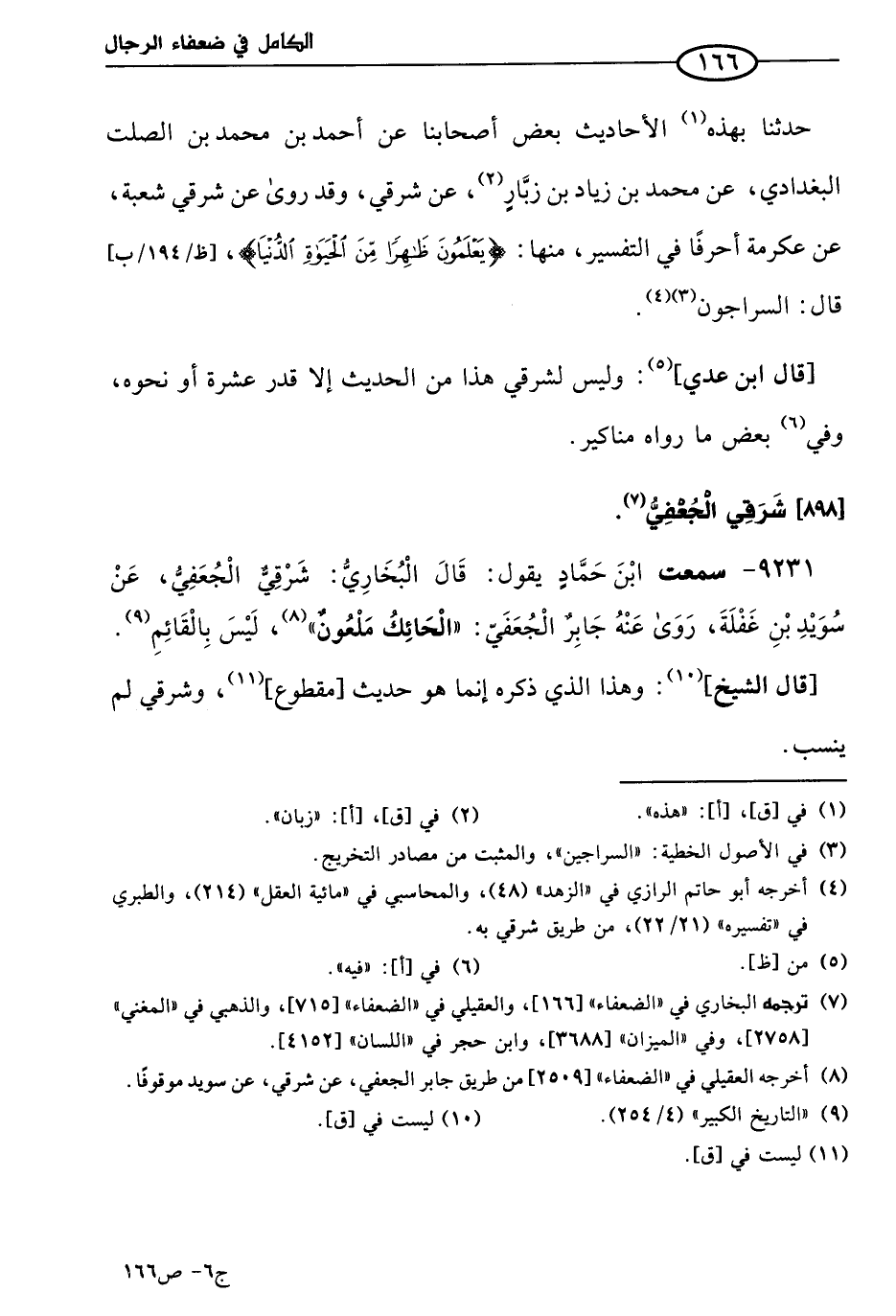 9231 - سمعتُ ابن حماد يقول: قال البُخاري: شرقي الجعفي عن سويد بن غفلة، روي عنه جابر الجعفي: الحائك ملعون، ليس بالقائم.