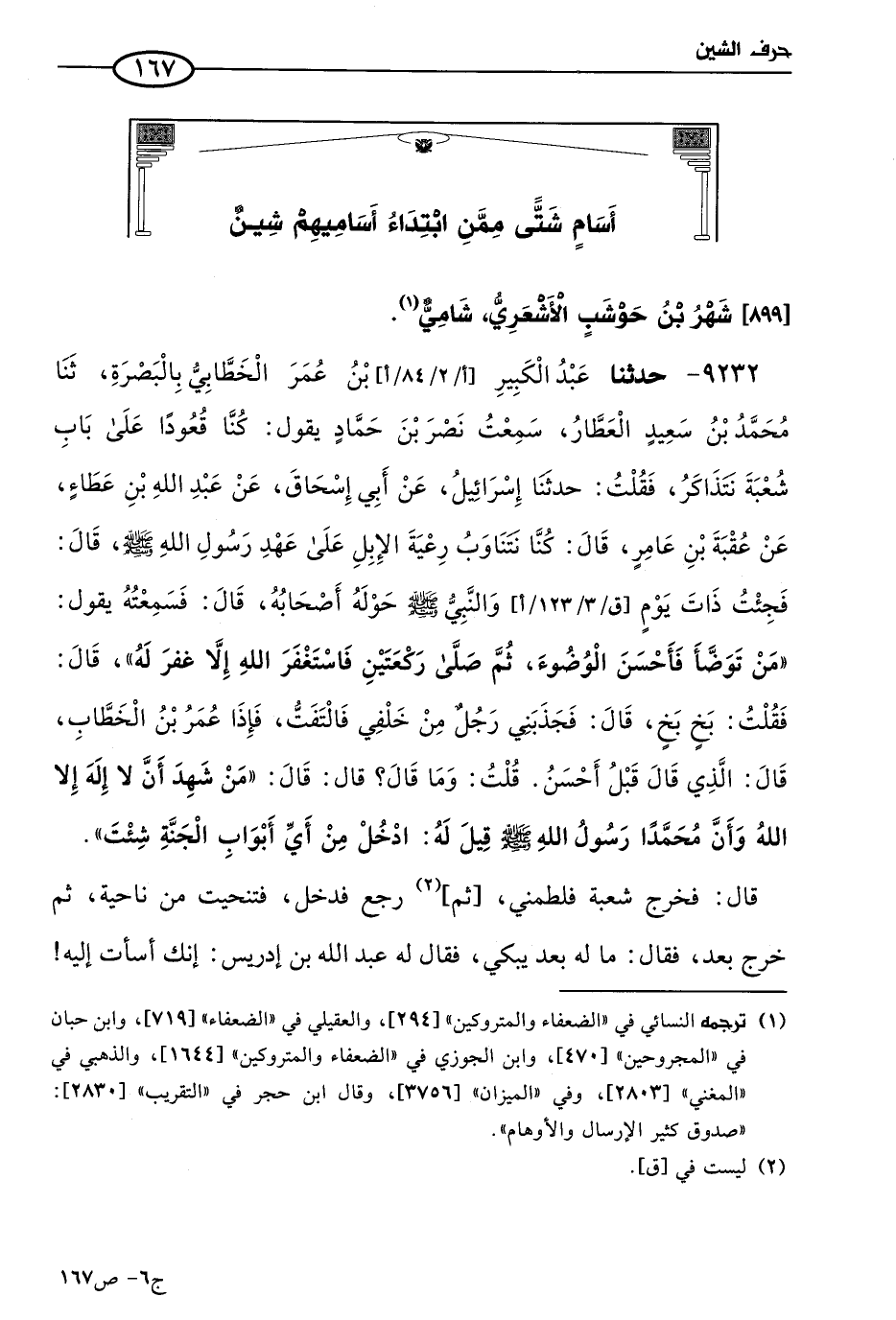 9232 - حَدثنا عَبد الكبير بن عُمر الخطابي بالبصرة، حَدثنا مُحمد بن سعيد العطار، سمعت نصر بن حماد يقول: كنا قعودا علي باب شُعبَة نتذاكر فقلت: حَدثنا إسرائيل، عن أبي إسحاق، عن عَبد الله بن عَطاء، عن عقبة بن عامر قال: كُنا نتناوب رعية الإبل علي عهد رسول الله صَلي الله عَليه وسَلم، قال: فجئت ذات يوم والنبي صَلي الله عَليه وسلم حوله أصحابه قال: فسمعته يقول: مَن توضأ فأحسن الوضوء ثم صلي ركعتين، فاستغفر الله إلا غُفر له. قال: فقلت: بخ بخ، قال: فجذبني رجل من خلفي، فالتفت فإذا عُمر بن الخطاب، قال: الذي قال قَبْلُ أحسن، قلت: وما قال؟ قال: من شهد أن لا إله إلا الله، وأن محمدا رسول الله صَلي الله عَليه وسَلم، قيل له: ادخل من أي أبواب الجنة شئت.