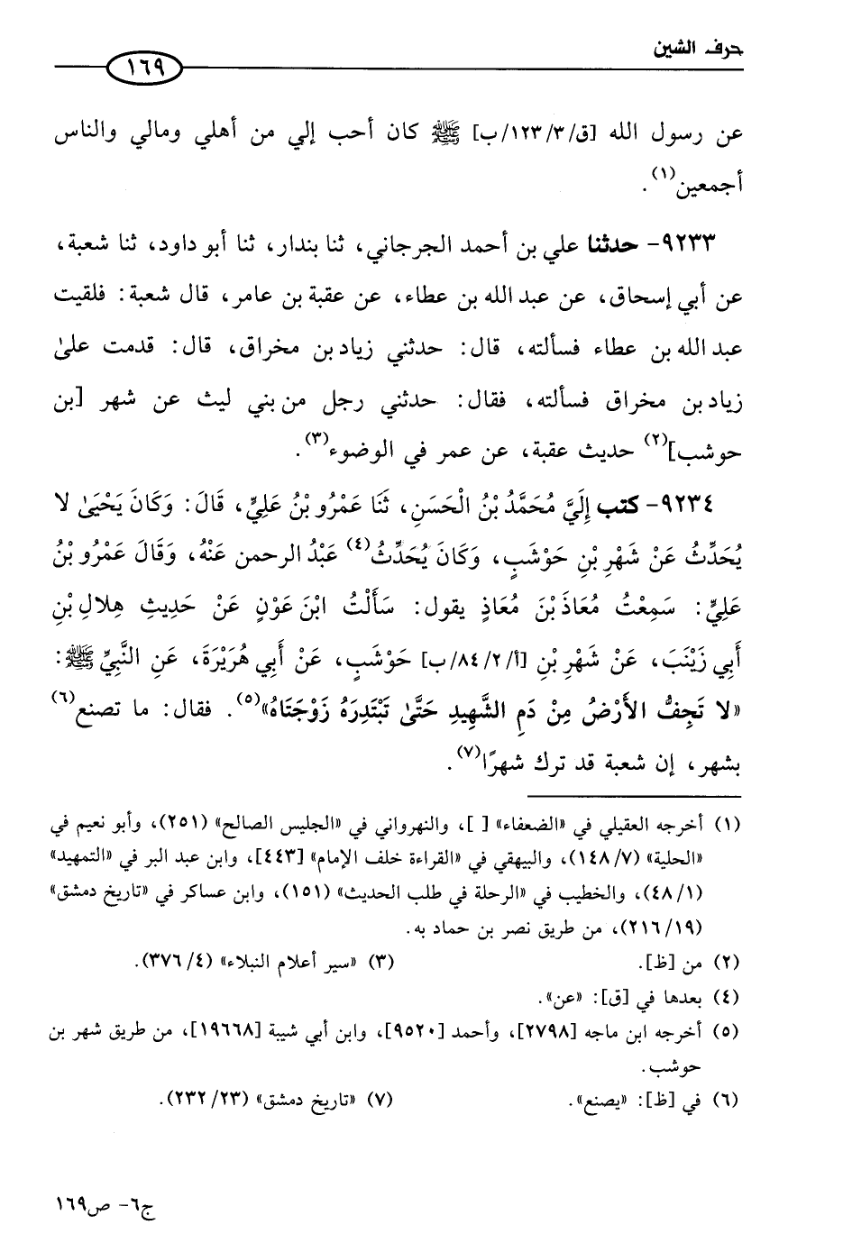 9234 - كتب إليَّ مُحمد بن الحسن، حَدثنا عَمرو بن علي قال: وكان يَحيي لا يُحَدِّثُ عن شَهْر بن حَوشَب، وكان يحدث عَبد الرحمن عنه. وقال عَمرو بن علي: سمعت معاذ بن معاذ يقولُ: سَألتُ ابن عون، عن حديث هلال بن أبي زينب، عن شَهْر بن حَوشَب، عن أبي هريرة، عن النبي صَلي الله عَليه وسلم: لا تجف الأرض من دم الشهيد حتي تبتدره زوجتاه. فقال: ما تصنع بشهر؟ إن شُعبَة قد ترك (1) شهرا.
