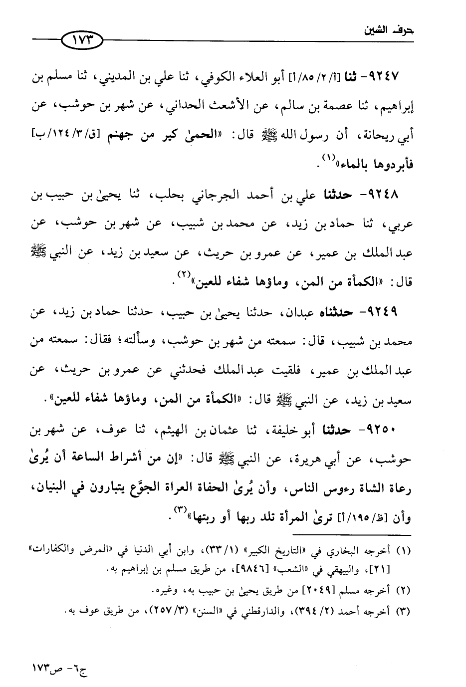 9249 - حدثناه عبدان، حَدثنا يَحيي بن حبيب، حَدثنا حماد بن زيد، عن مُحمد بن شبيب قال: سمعتُه من شَهْر بن حَوشَب، وسألته فقال: سمعتُه من عَبد الملك بن عُمَير، فلقيت عَبد الملك فحدثني عن عَمرو بن حريث، عن سعيد بن زيد، عن النبي صَلي الله عَليه وسَلم قال: الكمأة من المن، وماؤها شفاء للعين.