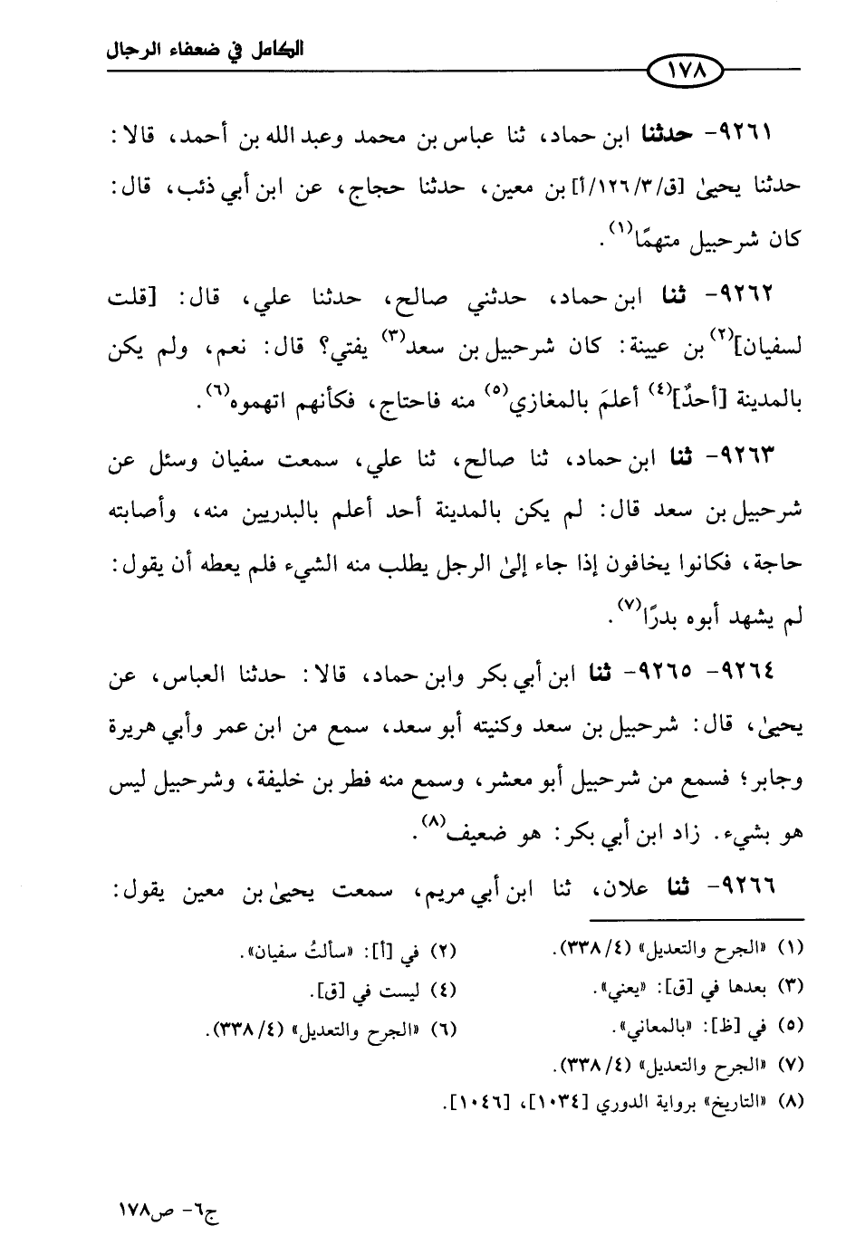 9266 - حَدثنا علان، حَدثنا ابن أبي مريم، سمعت يَحيي بن مَعين يقول: شرحبيل بن سعد ضعيف الحديث، يكتب حديثه.
