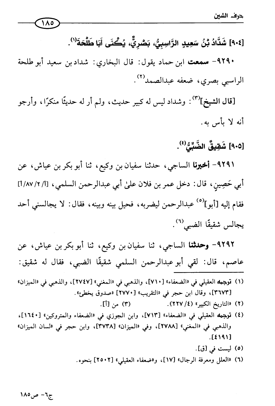 9290 - سمعتُ ابن حماد يقول: قال البُخاري: شداد بن سعيد أَبو طلحة الراسبي بصري، ضعفه عَبد الصمد.