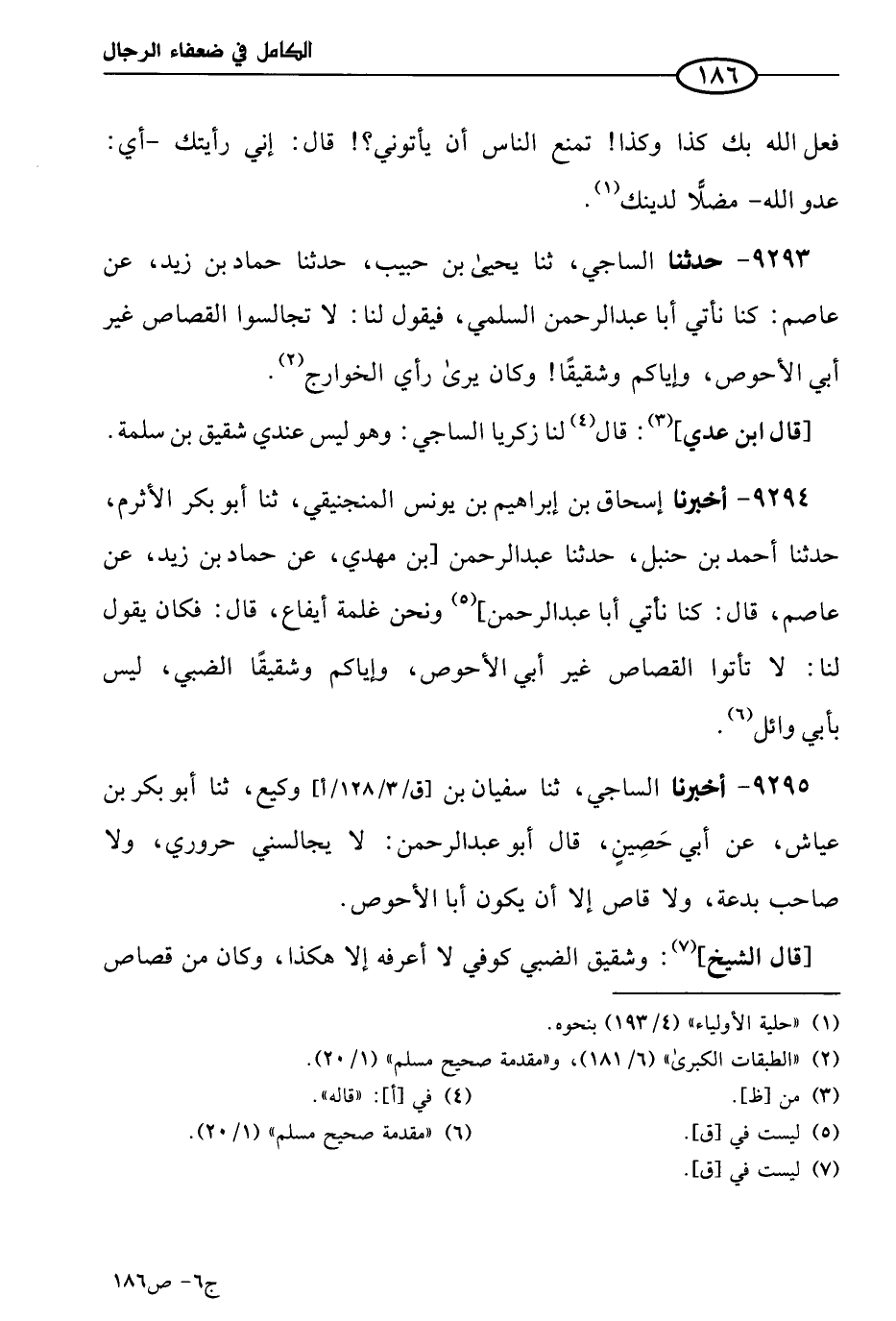 9293 - حَدثنا الساجي، حَدثنا يَحيي بن حبيب، حَدثنا حماد بن زيد، عن عاصم؛ كنا نأتي أبا عَبد الرحمن السلمي فيقول لنا: لا تجالسوا القصاص غير أبي الأحوص، وإياكم وشقيقا، وكان يري رأي الخوارج.