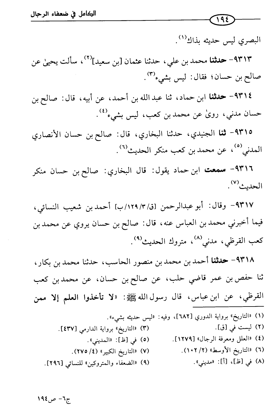 9318 - حَدثنا أحمد بن مُحمد بن منصور الحاسب، حَدثنا مُحمد بن بكار، حَدثنا حفص بن عُمر قاضي حلب، عن صالح بن حسان، عن مُحمد بن كعب القرظي، عن ابن عباس، قال رسول الله صَلي الله عَليه وسلم: لا تأخذوا العلم إلا ممن تجيزون شهادته.