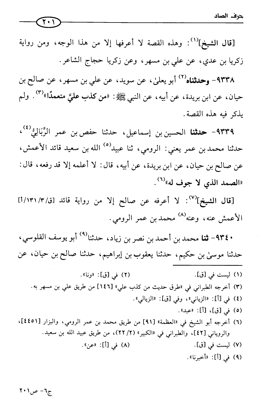 9338 - وحدثناه أَبو يعلي عن سويد عن علي بن مسهر عن صالح بن حيان، عن ابن بريدة، عن أبيه، عن النبي صَلي الله عَليه وسلم؛ من كذب علي متعمدا، ولم يذكر فيه هذه القصة.