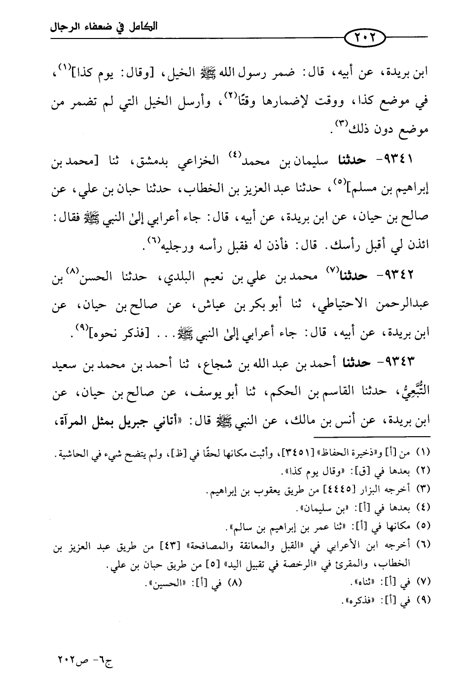 9341 - حَدثنا سليمان بن مُحمد الخزاعي بدمشق، حَدثنا مُحمد بن إبراهيم بن مسلم، حَدثنا عَبد العزيز بن الخطاب، حَدثنا حبان بن علي، عن صالح بن حيان، عن ابن بريدة، عن أبيه، قال: جَاء أعرابي إلي النبي صَلي الله عَليه وسلم فقال: ائذن لي أقبل رأسك قال: فأذن له فقبل رأسه ورجليه.