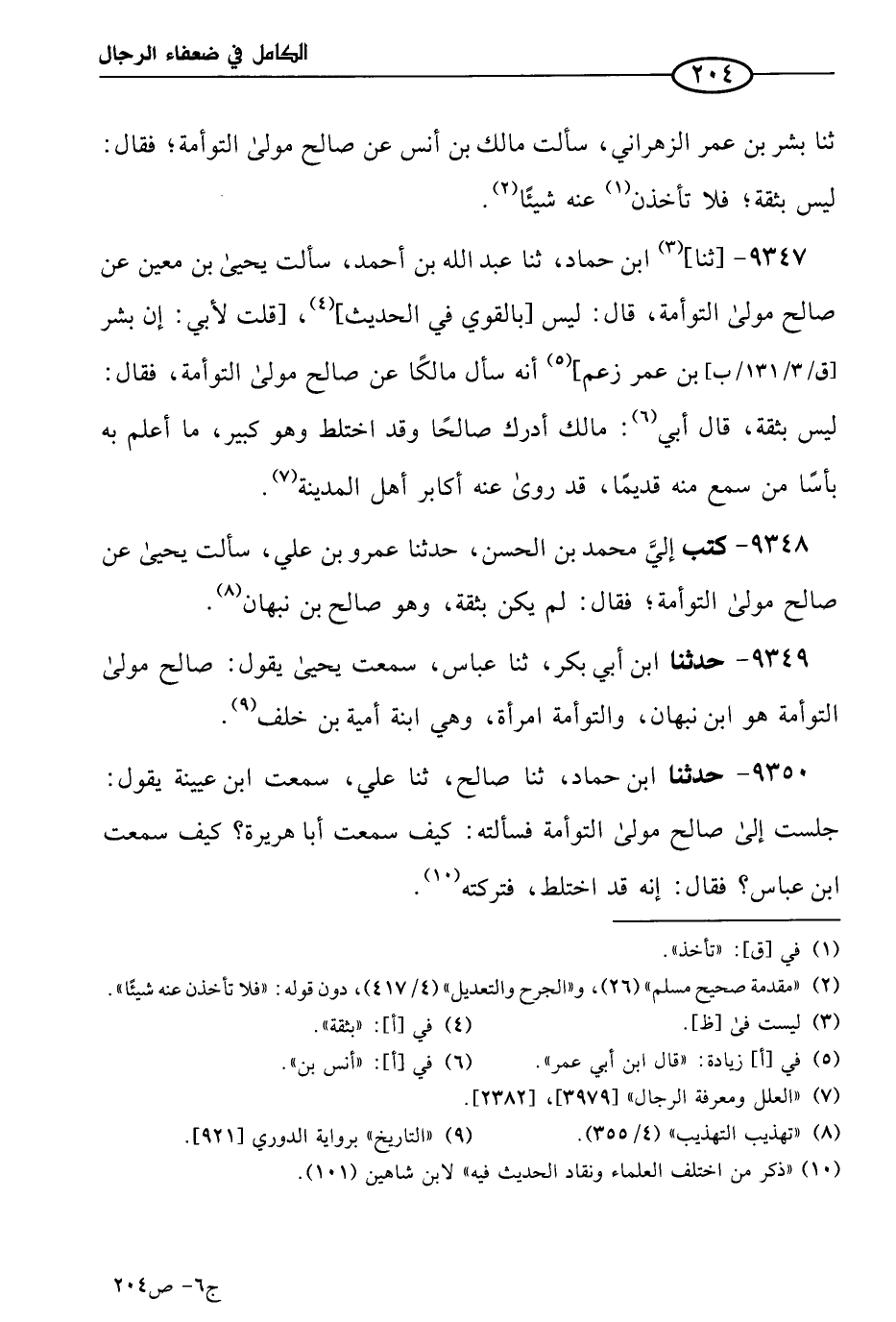 9348 - كتب إلي مُحمد بن الحسن، حَدثنا عَمرو بن علي سألت يَحيي عن صالح مولي التوأمة فقال: لم يكن بثقة، وهو صالح بن نبهان.