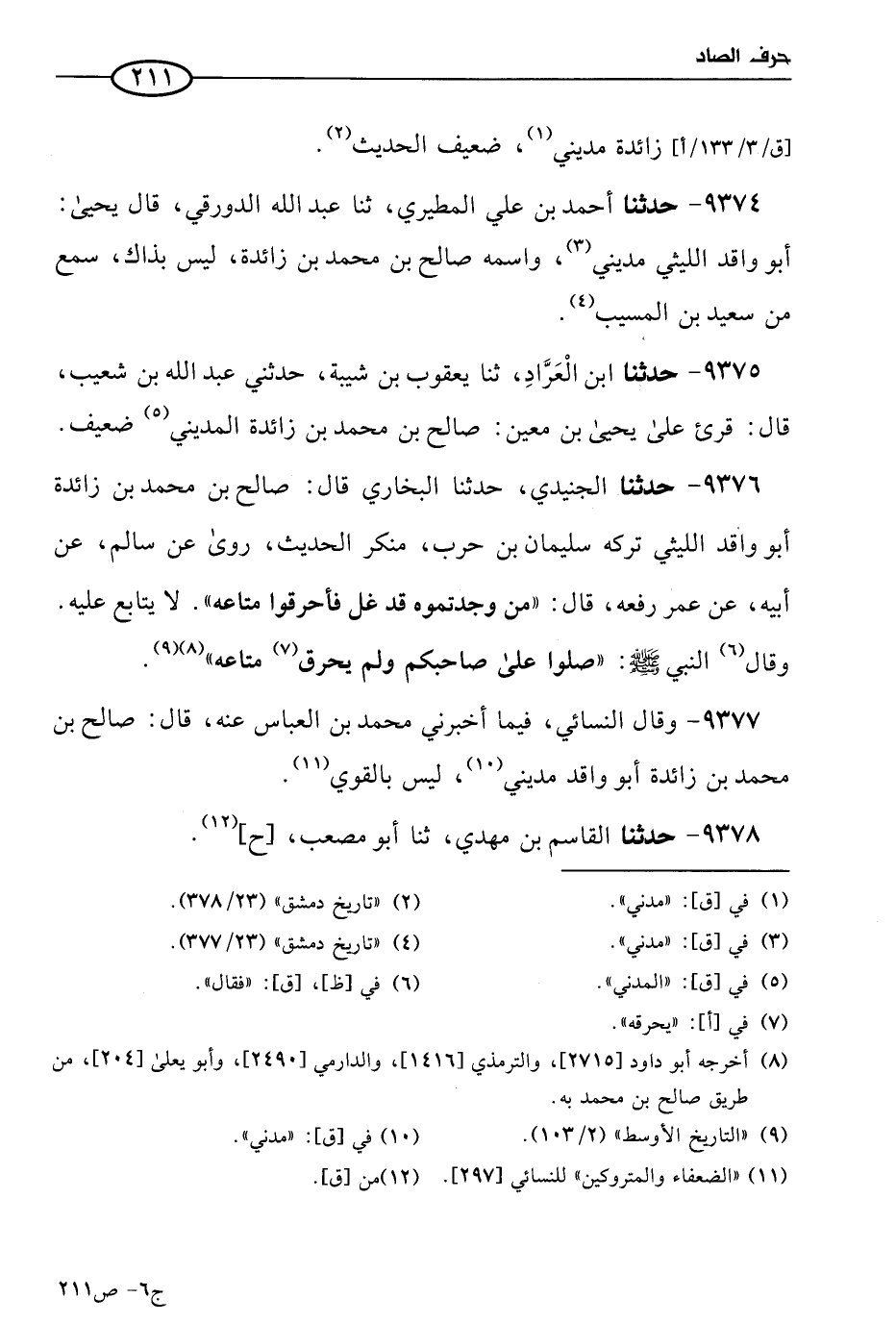 9376 - حَدثنا الجنيدي، حَدثنا البُخاري قال: صالح بن مُحمد بن زائدة أَبو واقد الليثي تركه سليمان بن حرب، منكر الحديث، روي عن سالم، عن أبيه، عن عُمر رفعه قال: من وجدتموه قد غل فأحرقوا متاعه، لا يُتَابَعُ عَليه، وقال النبي صَلي الله عَليه وسلم: صلوا علي صاحبكم، ولم يحرق متاعه.