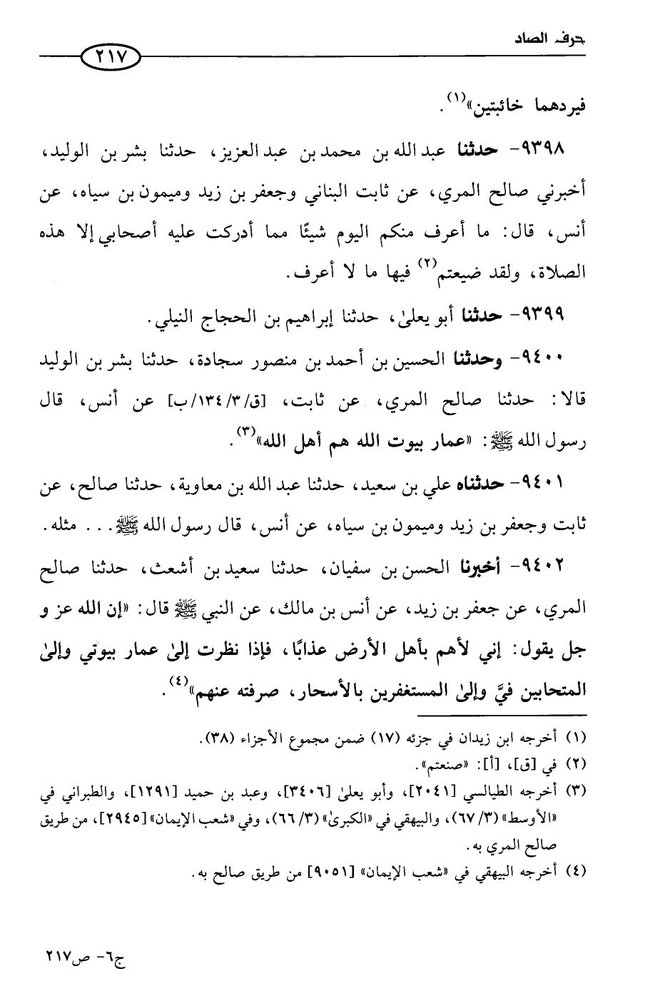 9400 - وحَدَّثنا الحسين بن أحمد بن منصور سجادة، حَدثنا بشر بن الوليد، قالا: حَدثنا صالح المري عن ثابت، عن أَنَس، قال رسول الله صَلي الله عَليه وسلم: عمار بيوت الله هم أهل الله.