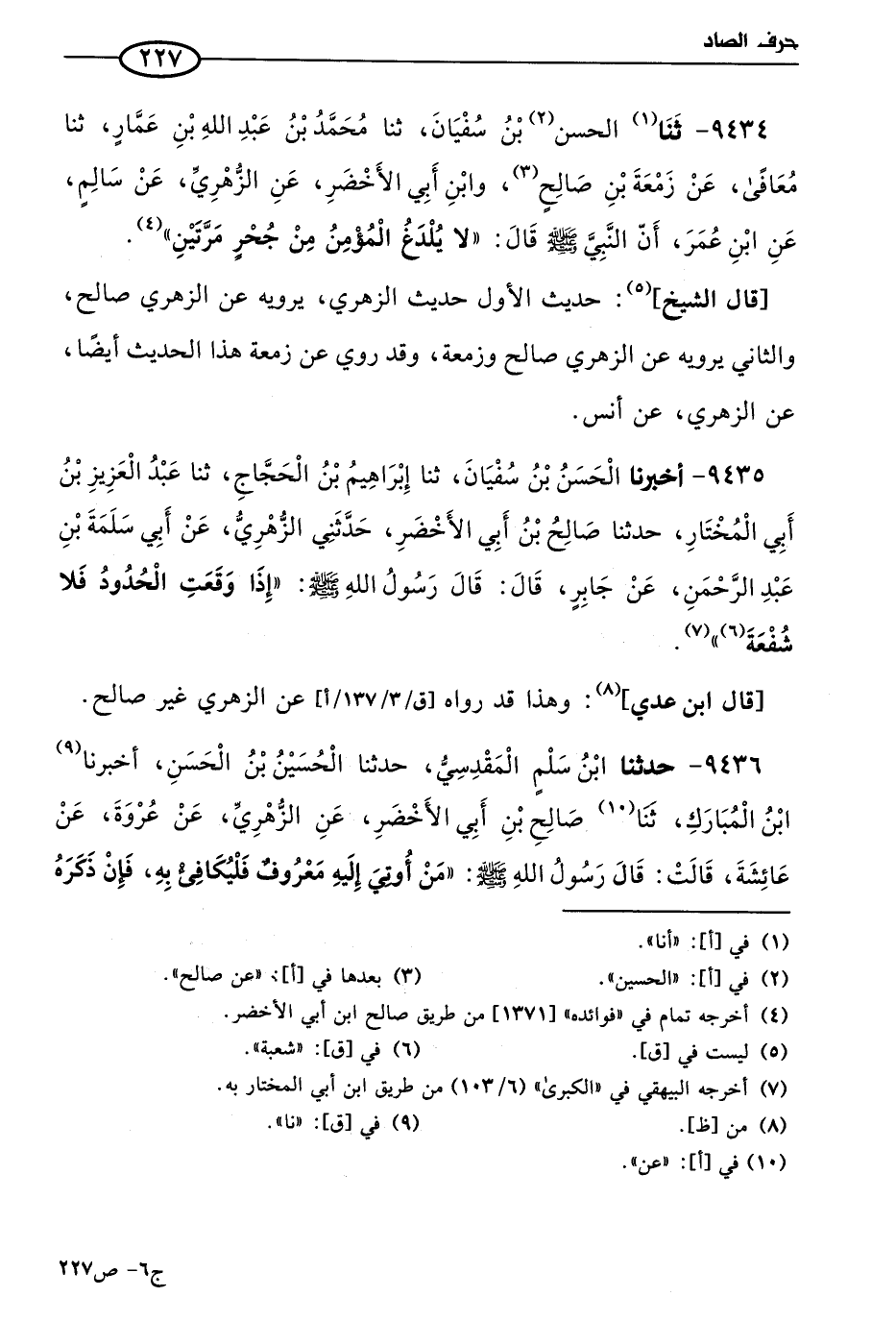 9435 - أخبرنا الحسن بن سفيان، حَدثنا إبراهيم بن الحجاج، حَدثنا عَبد العزيز بن أبي المختار، حَدثنا صالح بن أبي الأخضر، حَدَّثني الزُّهْري، عن أبي سلمة بن عَبد الرحمن، عن جابر، قال: قال رسول الله صَلي الله عَليه وسَلم: إذا وقعت الحدود فلا شفعة.