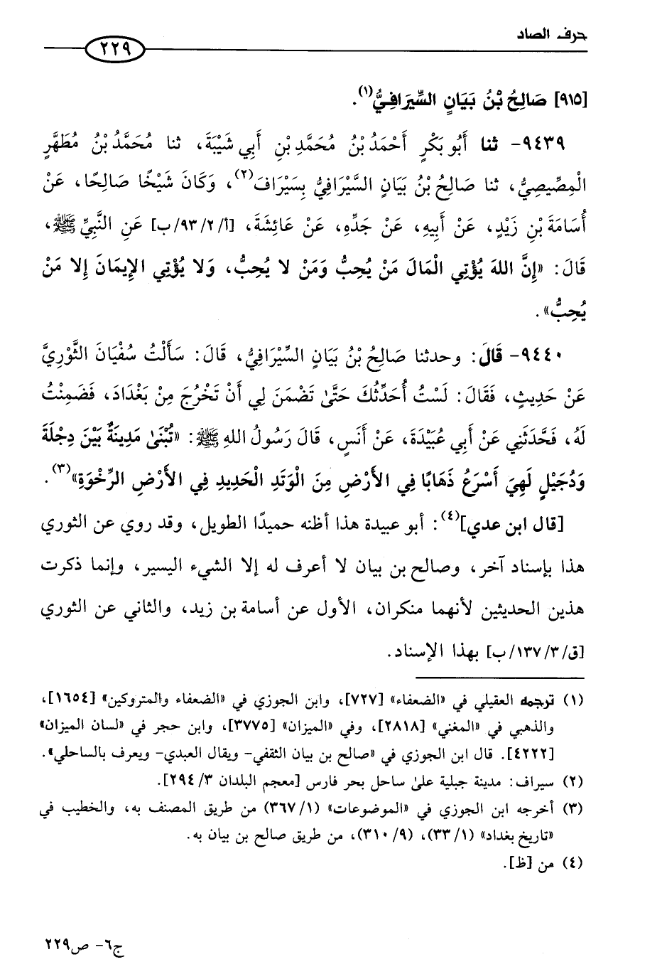 قال ابنُ عَدِي: أَبو عبيدة هذا أظنه حميدا الطويل، وقد رُويَ عن الثَّوري هذا بإسناد آخر، وصالح بن بيان لا أعرف له إلا الشيء اليسير، وإِنما ذكرت هذين الحديثين لأنهما منكران، الأول عن أسامة بن زيد، والثاني عن الثَّوري بهذا الإسناد.