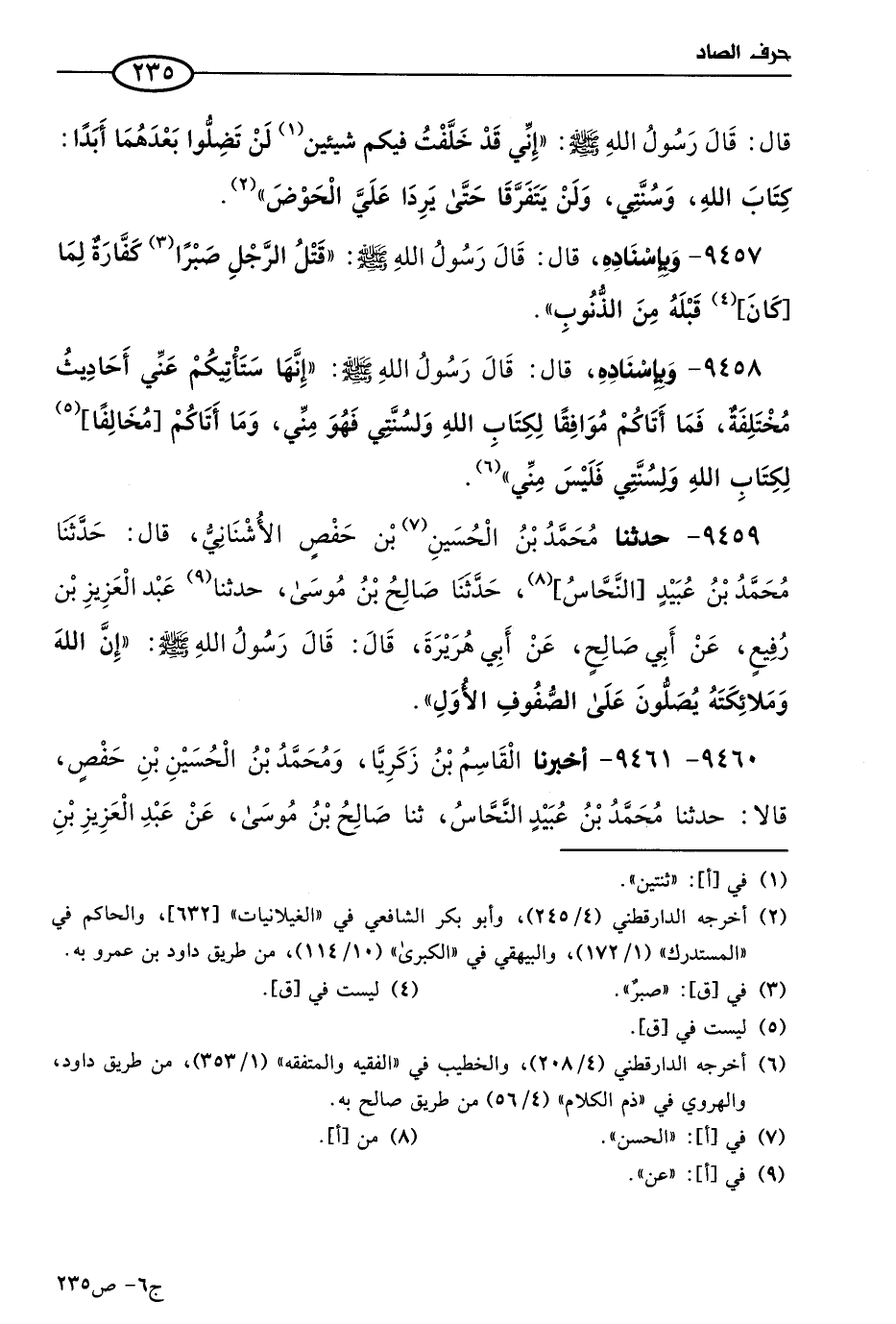 9460 - 9461 - أخبرنا القاسم بن زكريا، ومُحمد بن الحسين بن حفص، قالا: حَدثنا مُحمد بن عُبيد النحاس، حَدثنا صالح بن موسي، عن عَبد العزيز بن رفيع، عن أبي سلمة بن عَبد الرحمن بن عوف، عن أبيه، قال: قال رسول الله صَلي الله عَليه وسَلم: من عاد مريضا خاض الرحمة خوضا.