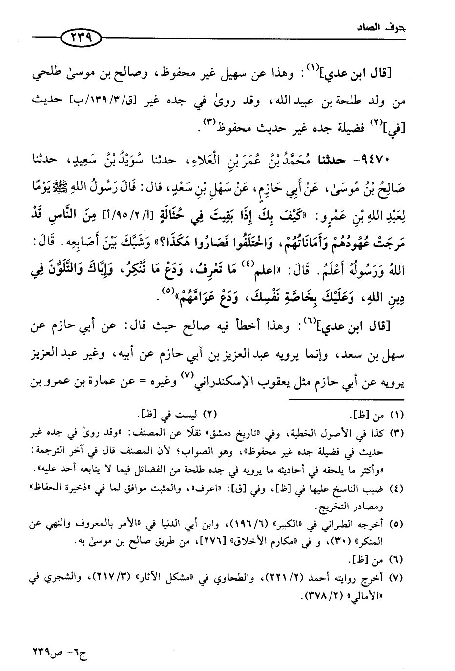قال ابنُ عَدِي: وهذا أخطأ فيه صالح حيث قال: عن أبي حازم عن سهل بن سعد، وإِنما يرويه عَبد العزيز بن أبي حازم: عن أبيه، وغير عَبد العزيز يرويه عن أبي حازم، مثل يعقوب الإسكندراني وغيره: عن عمارة بن عَمرو بن حزم، عن عَبد الله بن عَمرو، أَن النَّبي صَلي الله عَليه وسَلم قال له: كيف بك إذا بقيت في حثالة من الناس، فصار في الإسناد عمارة بن عَمرو بن حزم، فظن صالح بن موسي أنه أَبو حازم فقال: عن أبي حازم، وأَبو حازم صاحب سهل بن سعد، فقال: عن سهل بن سعد، وهذا الإسناد كان أسهل عليه من عمارة بن عَمرو بن حزم، عن عَبد الله بن عَمرو.
