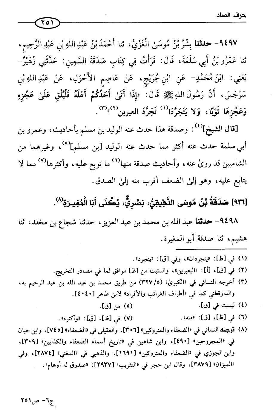 9498 - حَدثنا عَبد الله بن مُحمد بن عَبد العزيز، حَدثنا شجاع بن مخلد، حَدثنا هشيم، حَدثنا صدقة أَبو المغيرة.