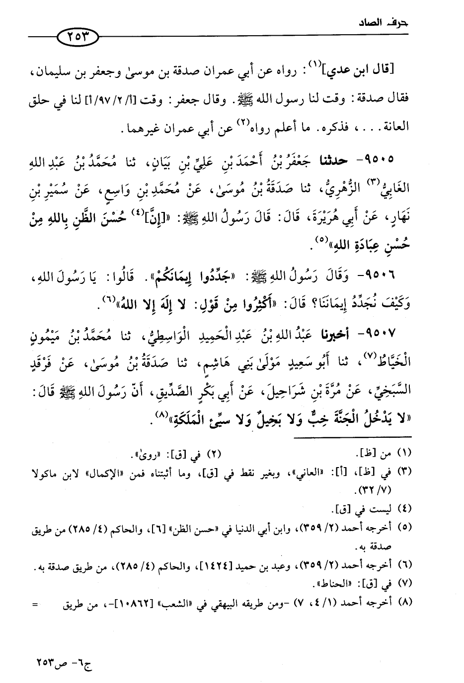 9507 - أخبرنا عَبد الله بن عَبد الحميد الواسطي، حَدثنا مُحمد بن ميمون الخياط، حَدثنا أَبو سعيد مولي بني هاشم، حَدثنا صدقة بن موسي عن فرقد السبخي عن مرة بن شراحيل، عن أبي بكر الصديق، أَن رسُول الله صَلي الله عَليه وسَلم قال: لا يدخل الجنة خِبٌّ، ولا بخيل، ولا سيء الملكة.