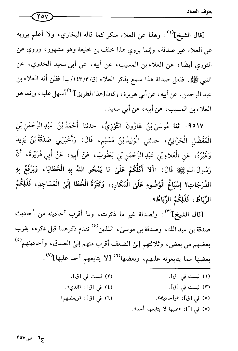 قال الشيخ: وهذا عن العَلاَء منكر كما قاله البُخاري، ولا أعلم يرويه عن العَلاَء غير صدقة، وإِنما يروي هذا خلف بن خليفة، وهو مشهور، ورُوي عن الثَّوري أَيضًا عن العَلاَء بن المُسَيَّب، عن أبيه، عن أبي سعيد الخدري، عن النبي صَلي الله عَليه وسلم، فلعل صدقة هذا سمع بذكر العلاء فظن أنه العلاء بن عَبد الرحمن، عن أبيه، عن أبي هريرة، وكان هذا الطريق أسهل عليه، وإِنما هو العلاء بن المُسَيَّب، عن أبيه، عن أبي سعيد.