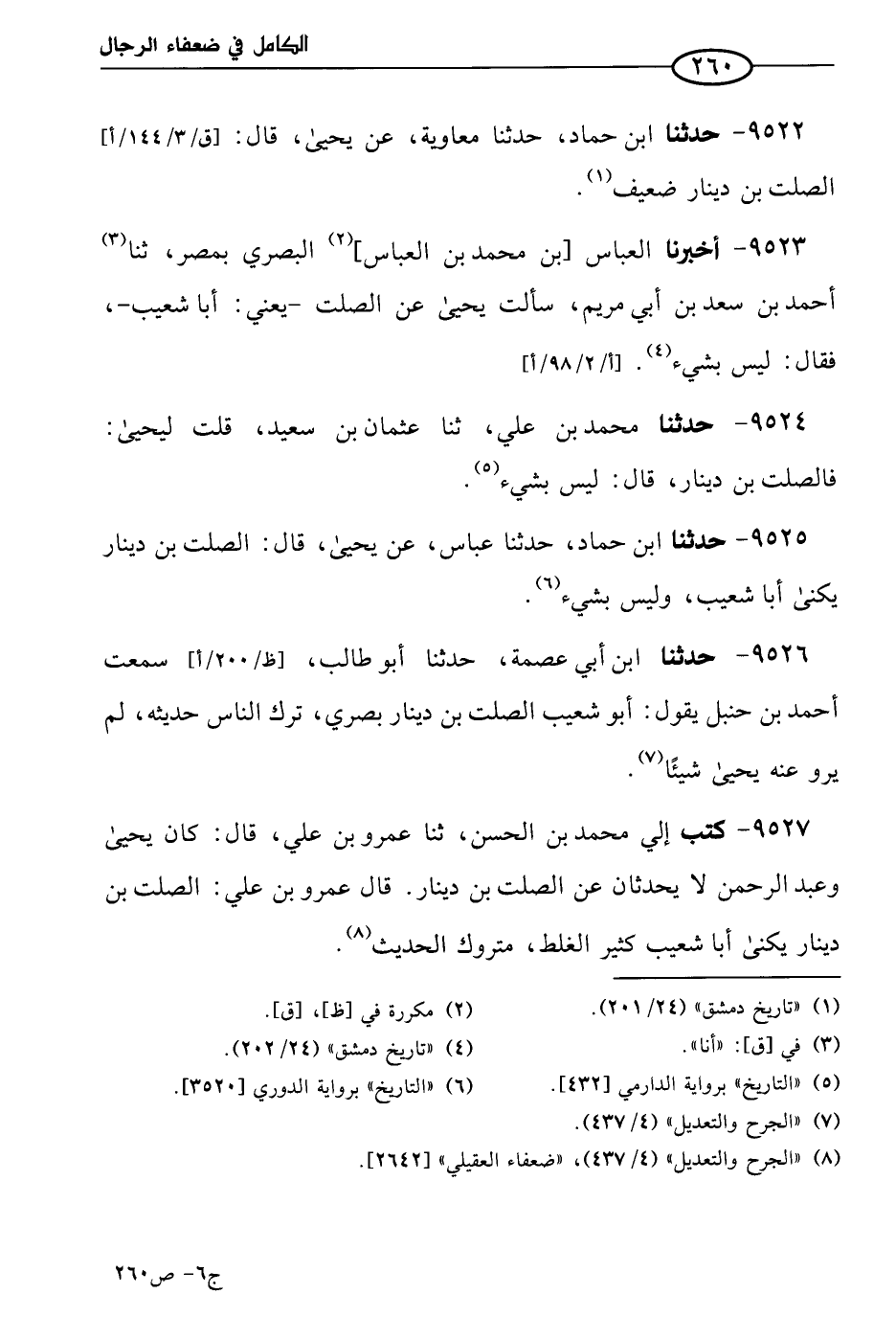 9522 - حَدثنا ابن حماد، حَدثنا معاوية، عن يَحيي، قال: الصلت بن دينار ضعيف.