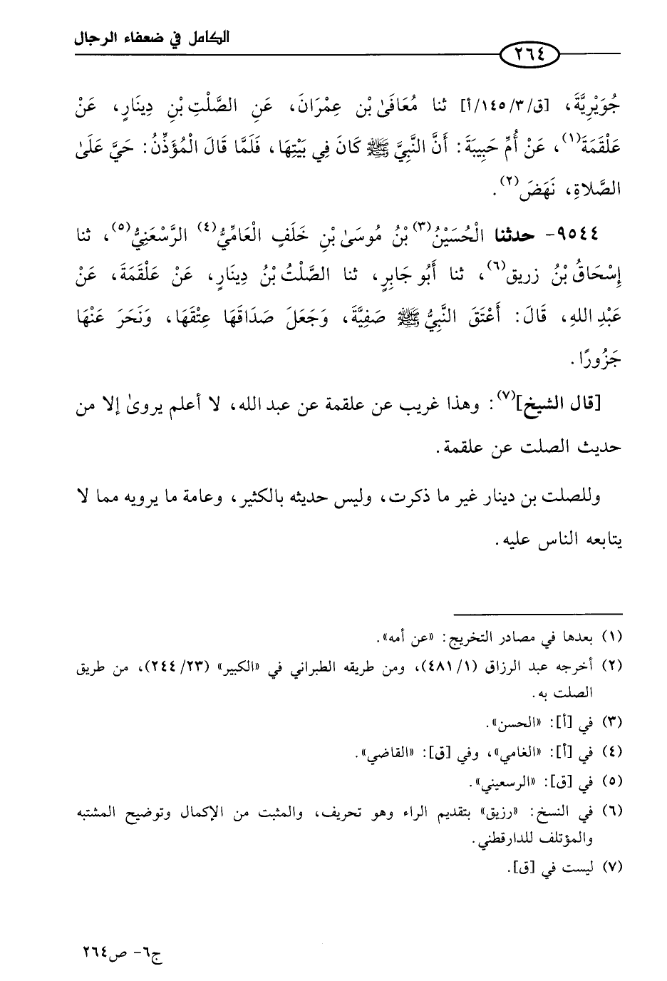قال الشيخ: وهذا غريب عن علقمة، عن عَبد الله، لا أعلم يُرْوَي إلا من حديث الصلت عن علقمة، وللصلت بن دينار غير ما ذكرت وليس حديثه بالكثير وعامة ما يرويه مما لا يتابعه الناس عليه.