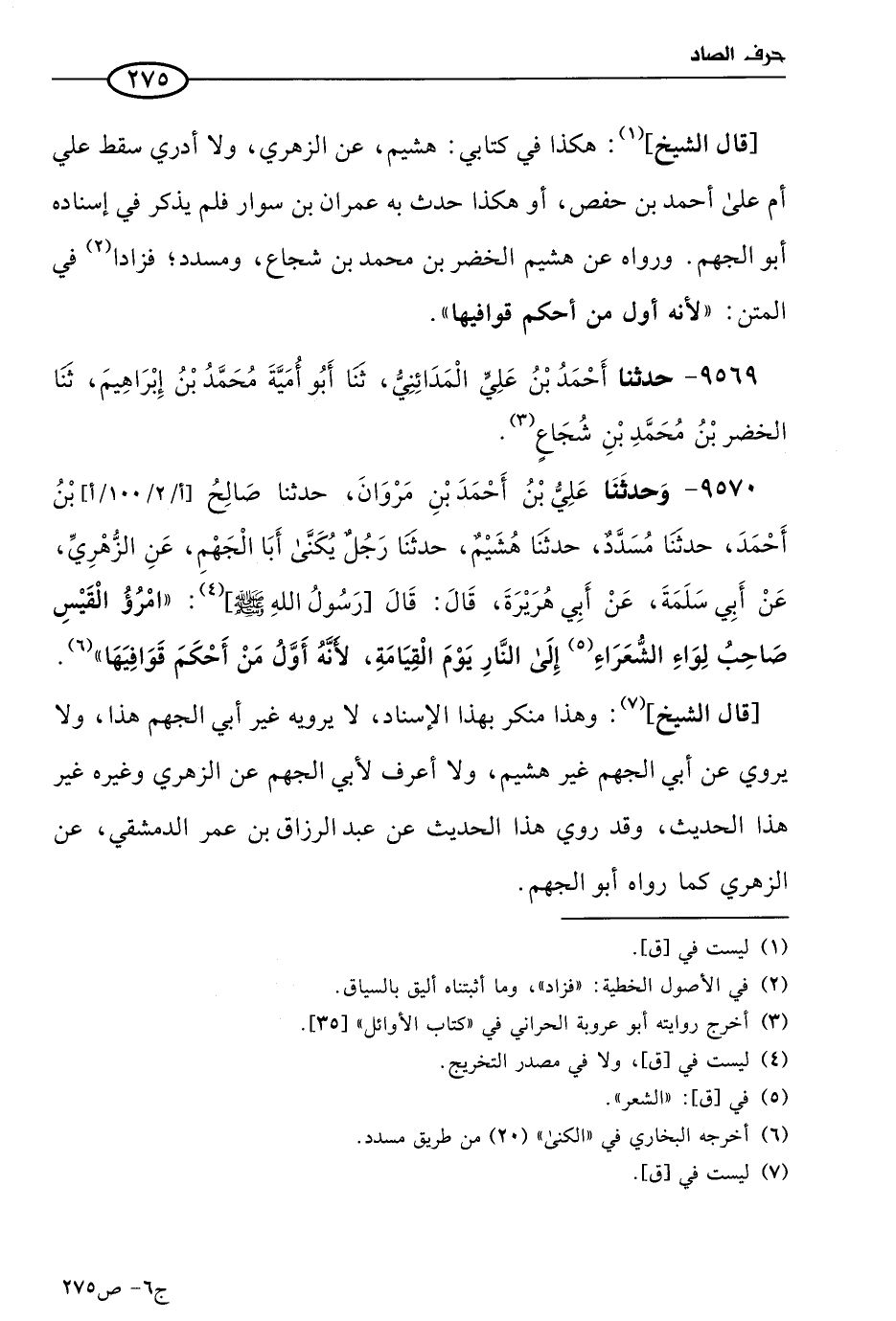 قال الشيخ: هكذا في كتابي: هشيم، عن الزُّهْري، ولا أدري سقط عليَّ، أم علي أحمد بن حفص، أو هكذا حدث به عمران بن سوار، فلم يذكر في إسناده: أبا الجهم (1). ورواه عن هشيم: الخضر بن مُحمد بن شجاع، ومسدد، فزادا في المتن: لأنه أول من أحكم قوافيها.